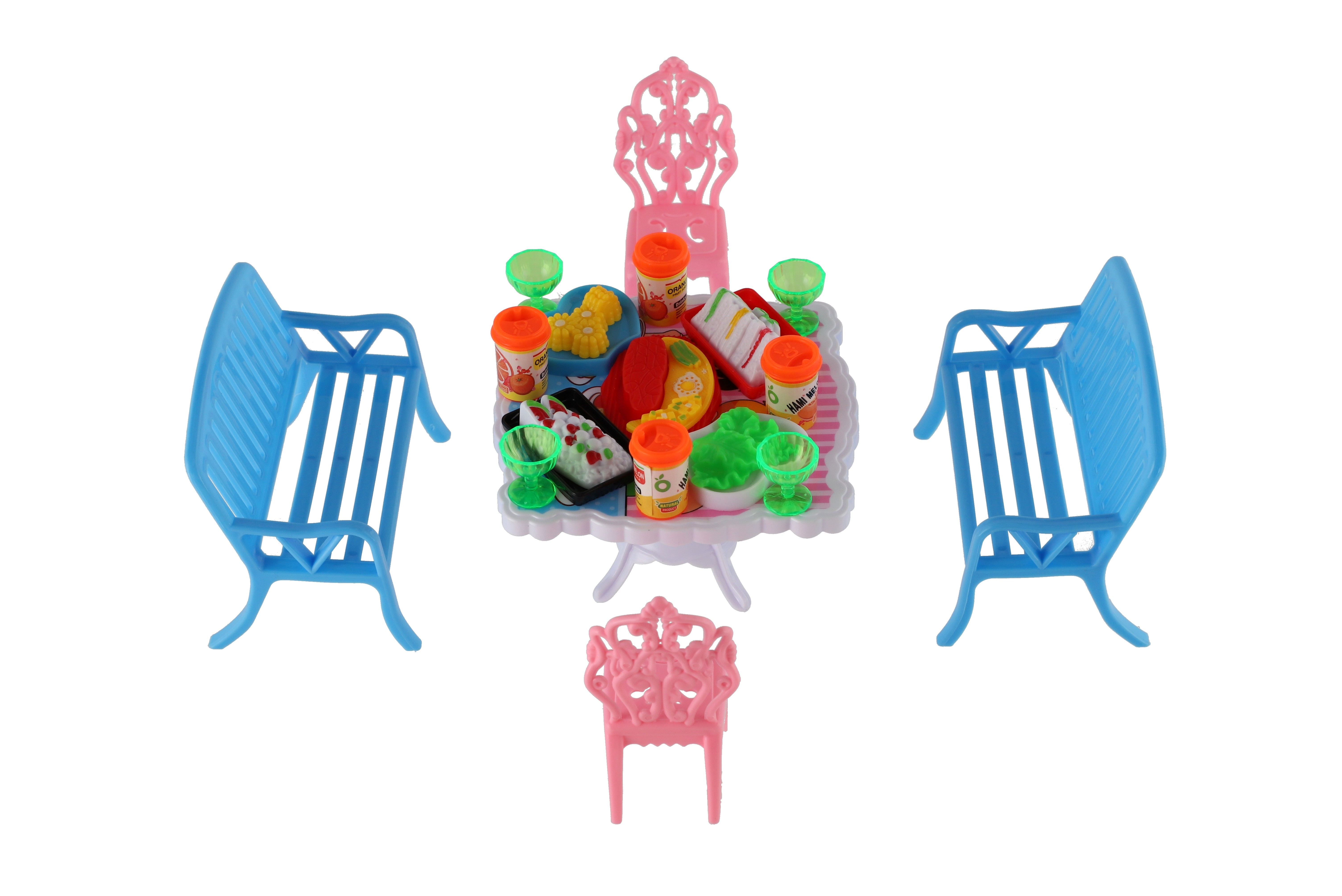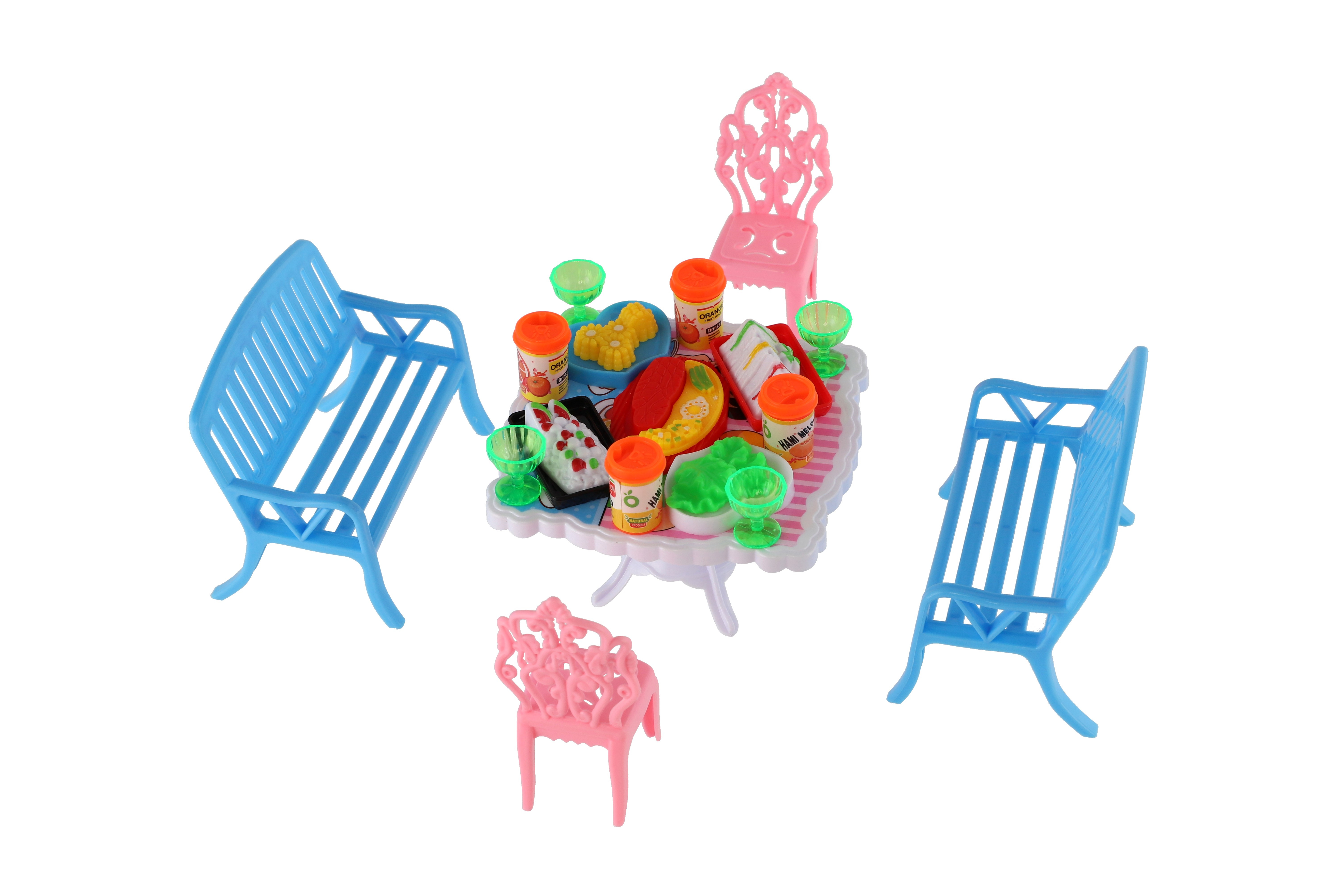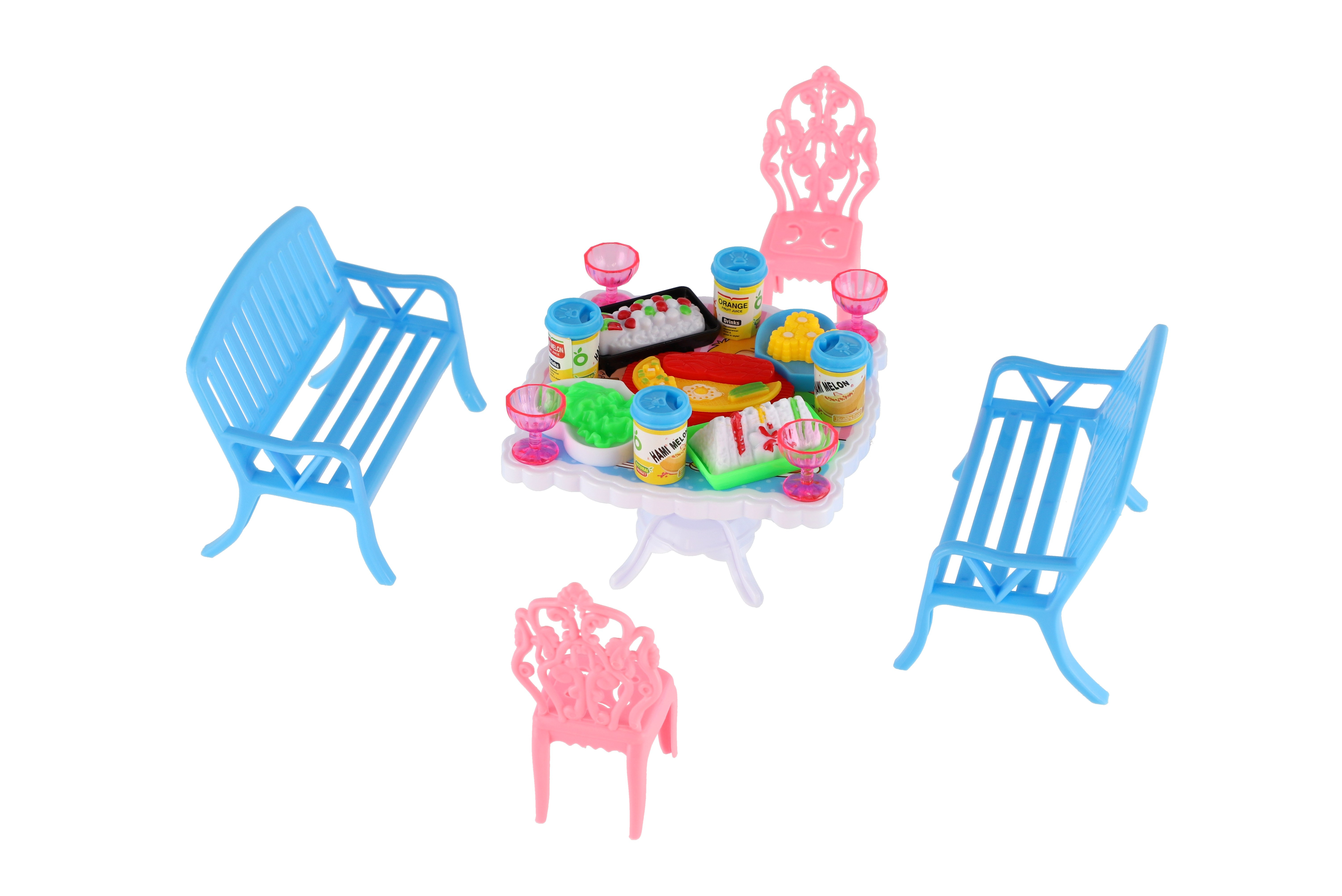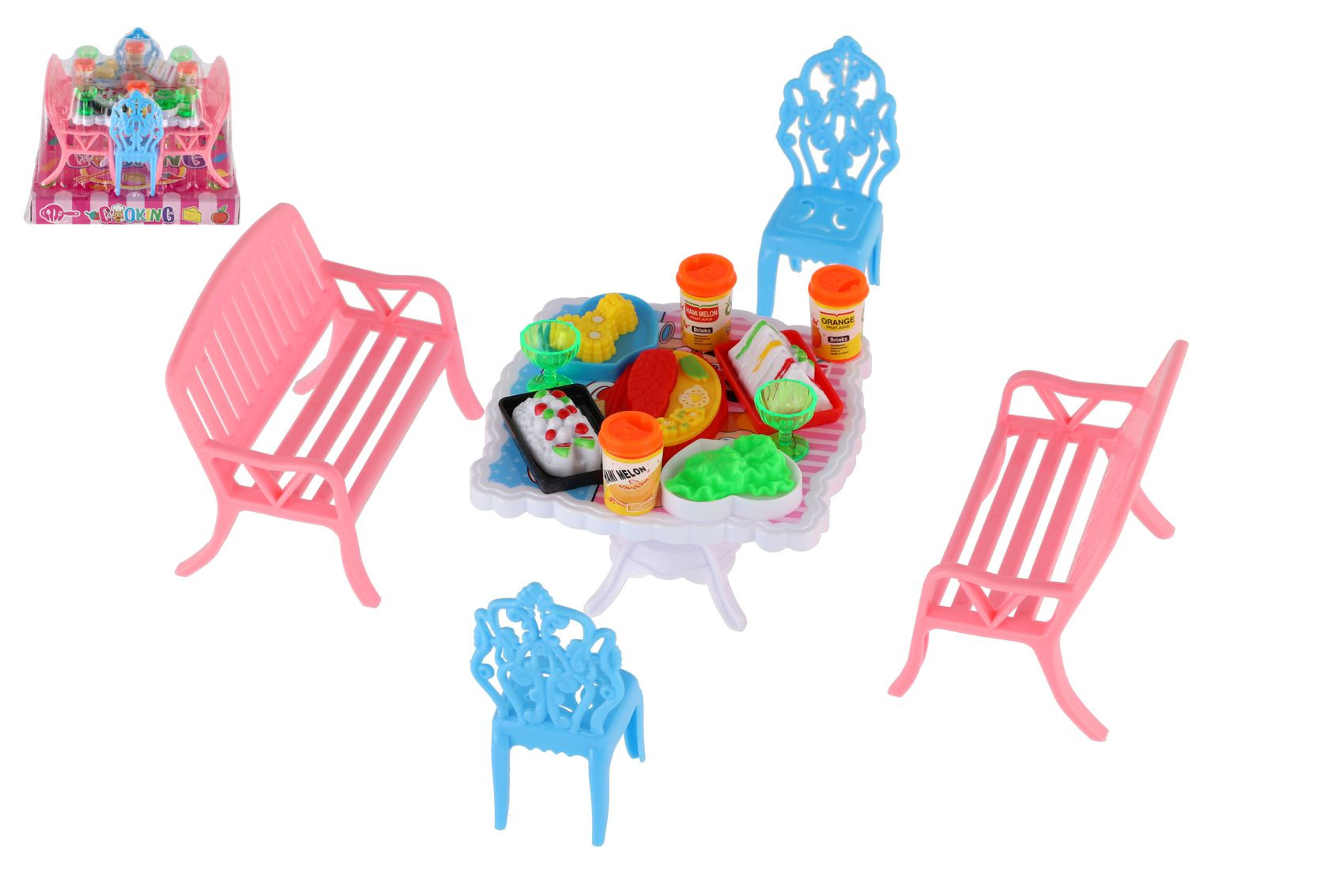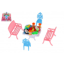 Potřebujete Vašim panenkám zpříjemnit sezení před domečkem? V tom případě je tato sada přesně pro Vás. Dvě lavičky, dvě židličky, stůl a doplňky v podobně pohoštění na stůl bude jistě oblíbenou část obydlí pro panenky. Rozměr balení: 14 x 11 x 16 cm Vhodné pro děti od 3 let
