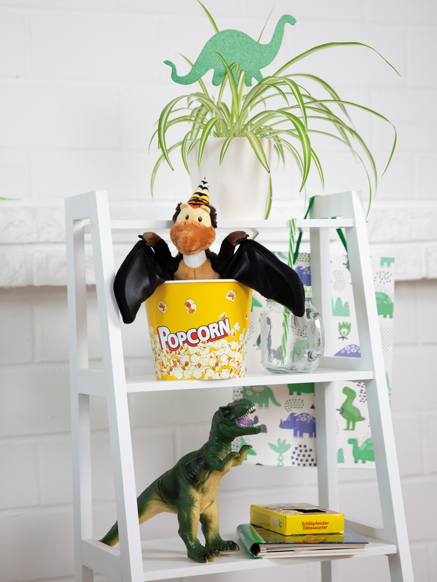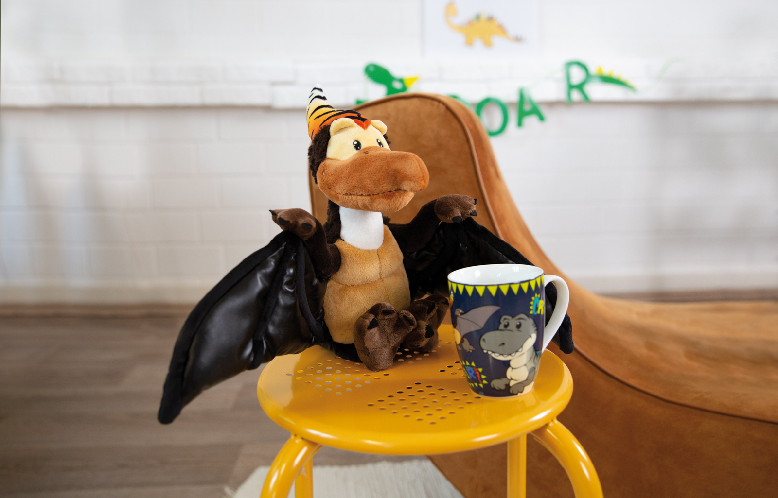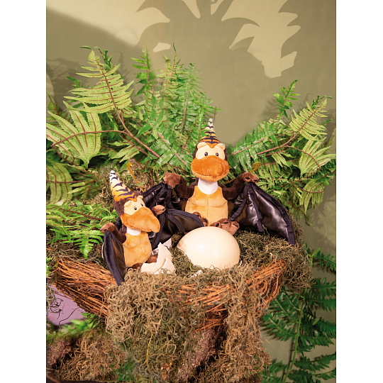 Veselý dinosaurus Orny se pyšní svými velkými křídly, na které je náležitě hrdý. Pruhovaný roh a huňaté tělo z něj dělají dobrého společníka. S kroužkem na hlavě jako klíčenka. V sérii GREEN se téměř výhradně používají plyšové a výplňové materiály vyrobené z recyklovaných materiálů. Výška: 10cm. Věk: 3+