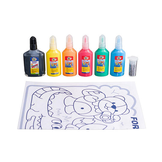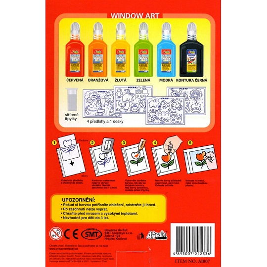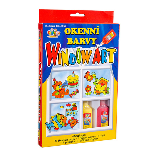 Okenní barvy, které zabaví každého malého tvořivce a ozdobí okna! Nejprve nakreslíte na folii konturou obrysy a po zaschnutí vybarvíte barvami, tak, aby se barvy dotýkaly obrysů. Opět necháte zaschnout a poté už jen slepíte z folie a umístíte kamkoliv na okno či zrcadlo. Kreslit můžete podle předlohy nebo dle fantazie! Balení obsahuje 5 základních barev po 20 ml a černou 30ml konturu, fólii, 4 předlohy, stříbrné třpytky. Rozměr balení: 16 x 26 x 3,2 cm Vhodné pro děti od 5 let