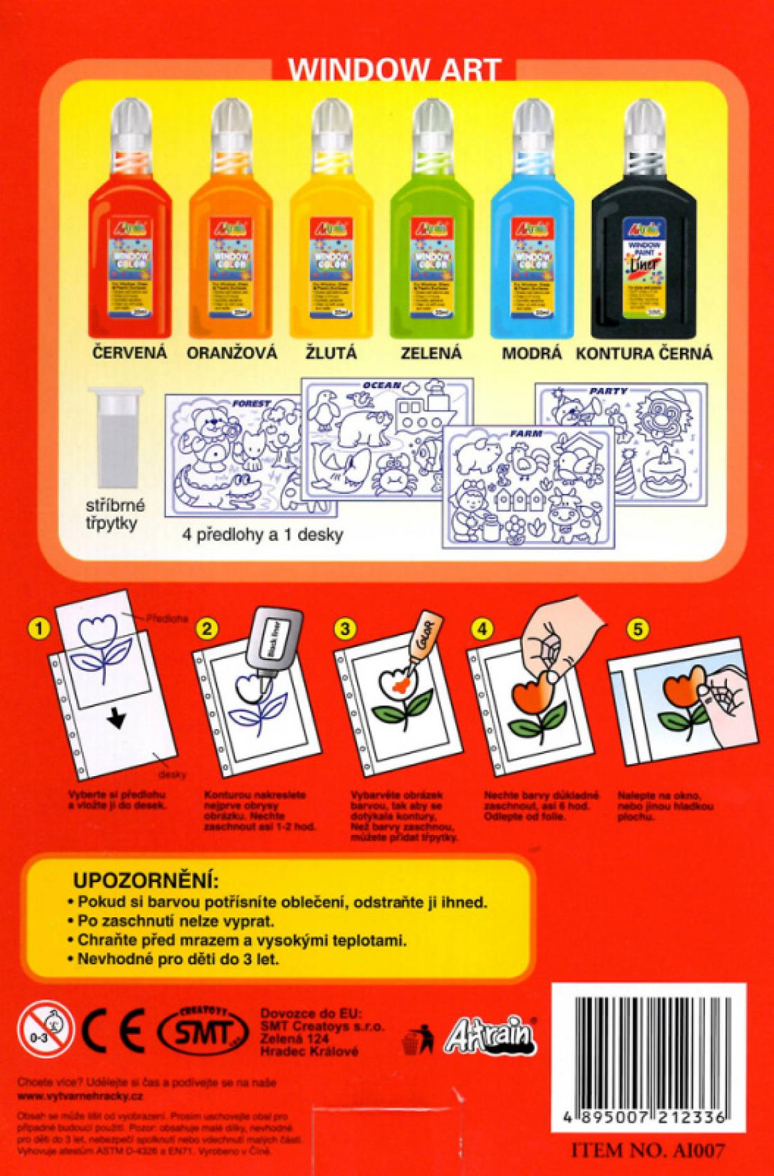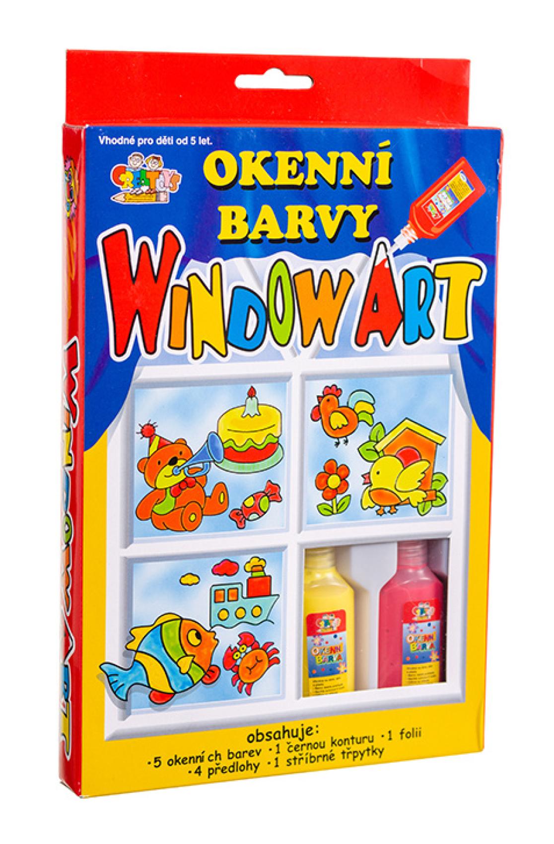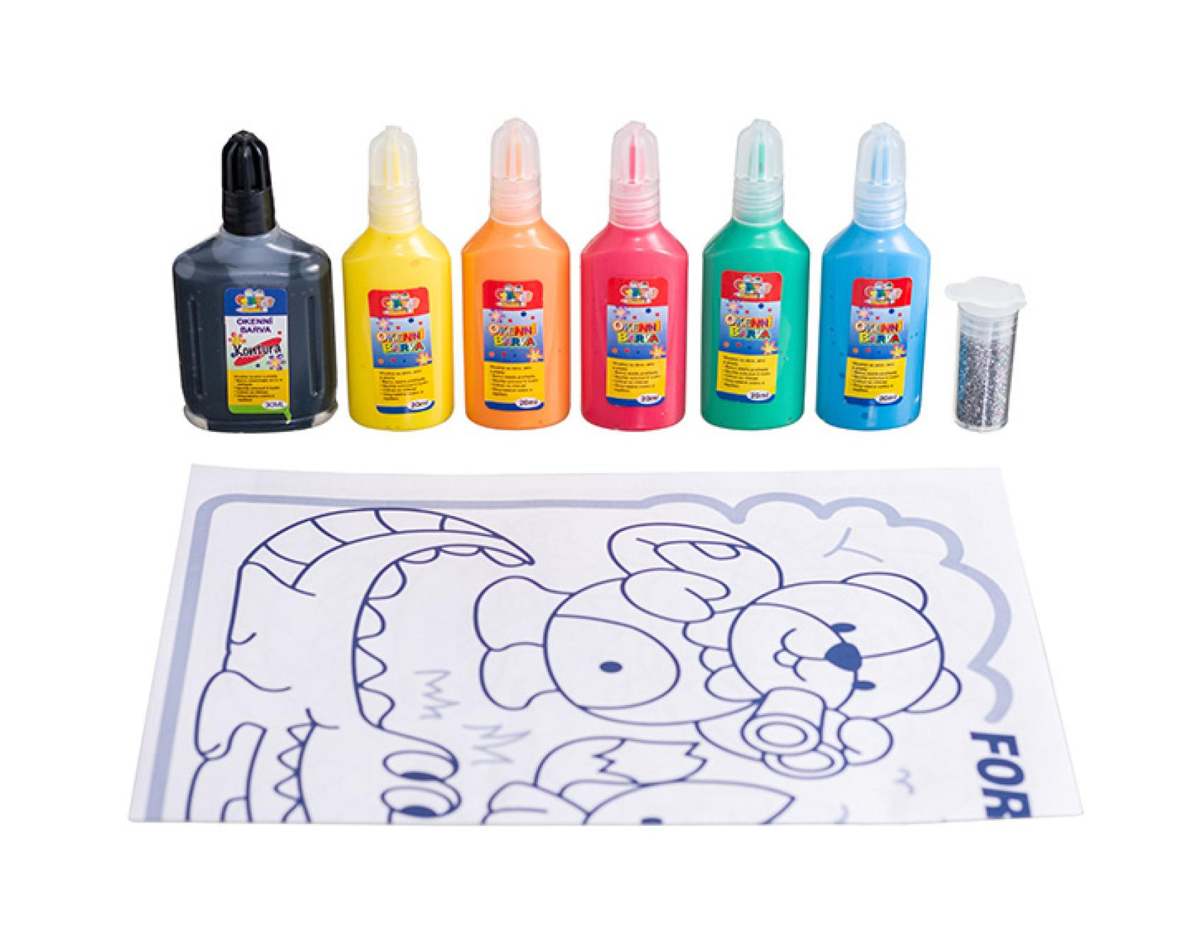 Okenní barvy, které zabaví každého malého tvořivce a ozdobí okna! Nejprve nakreslíte na folii konturou obrysy a po zaschnutí vybarvíte barvami, tak, aby se barvy dotýkaly obrysů. Opět necháte zaschnout a poté už jen slepíte z folie a umístíte kamkoliv na okno či zrcadlo. Kreslit můžete podle předlohy nebo dle fantazie! Balení obsahuje 5 základních barev po 20 ml a černou 30ml konturu, fólii, 4 předlohy, stříbrné třpytky. Rozměr balení: 16 x 26 x 3,2 cm Vhodné pro děti od 5 let