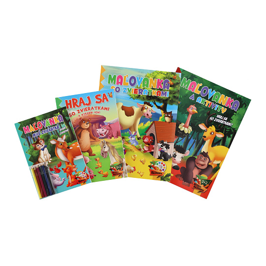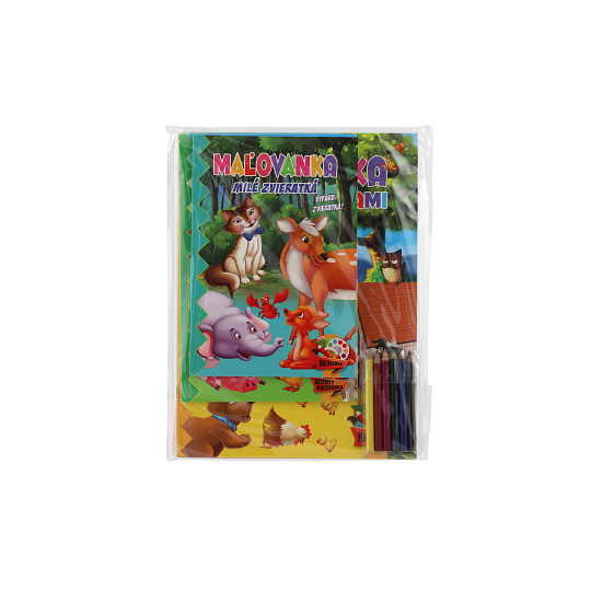 Omalovánky+aktivity/Maľovanky+aktivity Zvířátka/zvieratká 4ks + pastelky CZ+SK verze v sáčku 21x29cm
