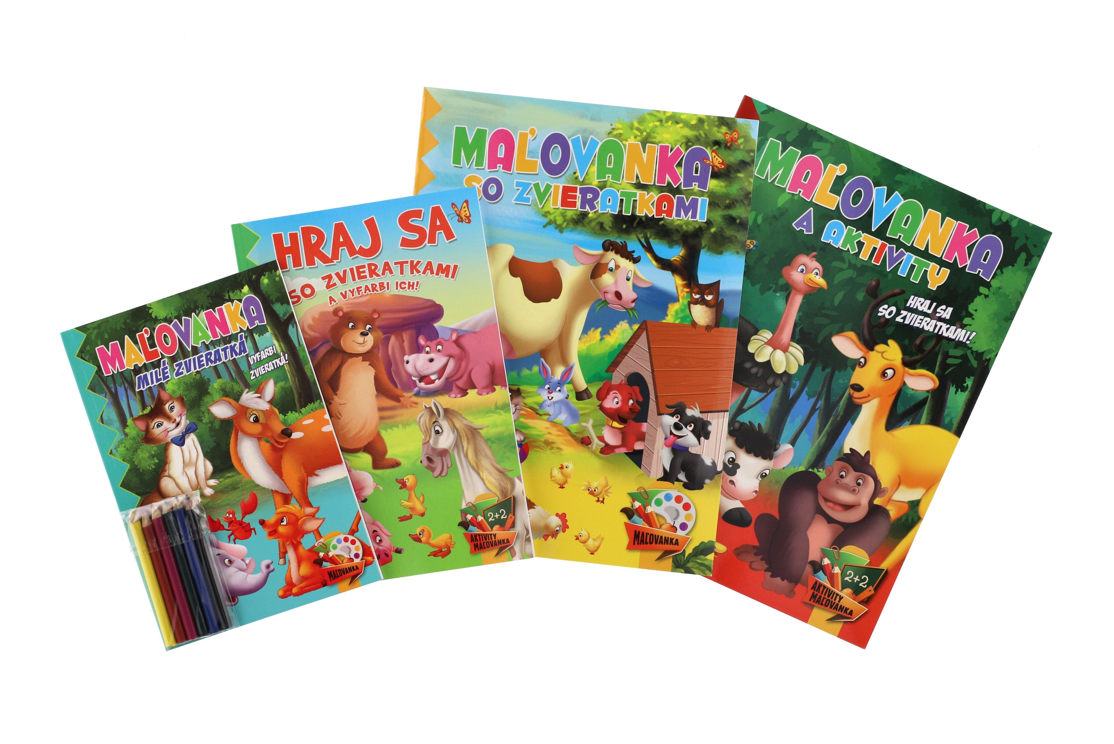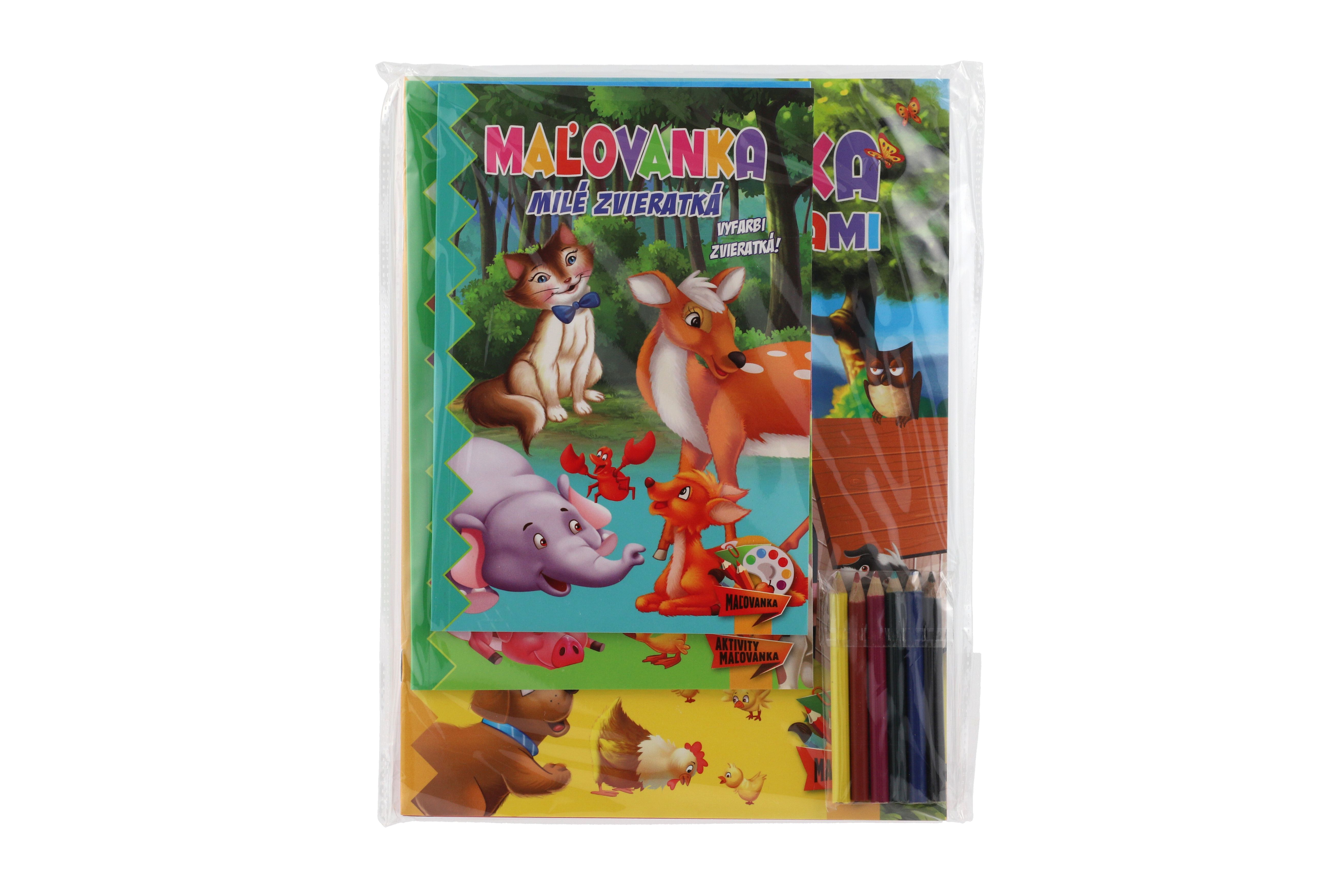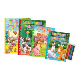 Omalovánky+aktivity/Maľovanky+aktivity Zvířátka/zvieratká 4ks + pastelky CZ+SK verze v sáčku 21x29cm