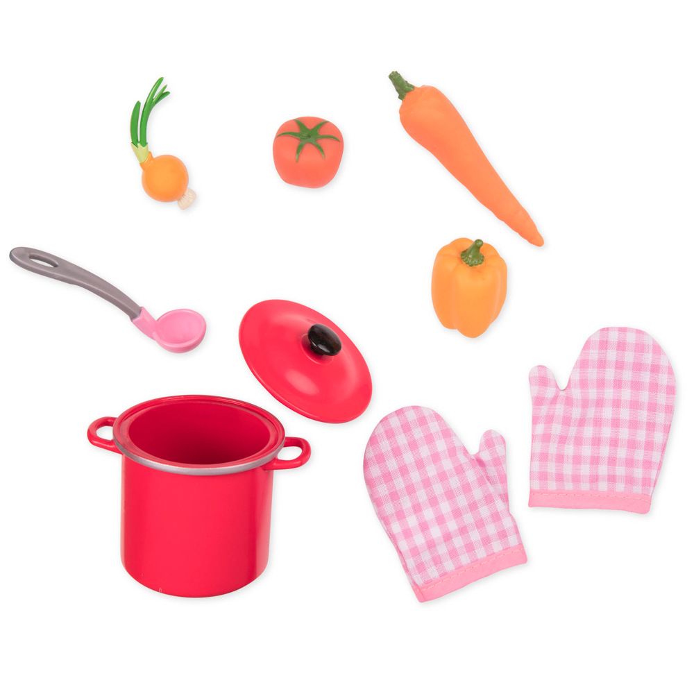 Our Generation – Set Vaříme ze zeleniny je vhodný pro panenky velikosti 46 cm. Součástí balení je hrnec na polévku s pokličkou, naběračka, rukavice a 4 druhy zeleniny. Uvařte se svou panenkou skvělé zeleninové pochoutky! Nezapomeňte, že láska prochází žaludkem. Co bude dnes dobrého? Pozor na horký hrnec! Použijte rukavice, aby ruce Vašich panenek zůstaly v bezpečí. Existuje tolik skvělých panenek naší generace, doplňků a oblečení, ze kterých si můžete vybrat. Vytvořte si svůj vlastní svět fantazie a hra může začít.