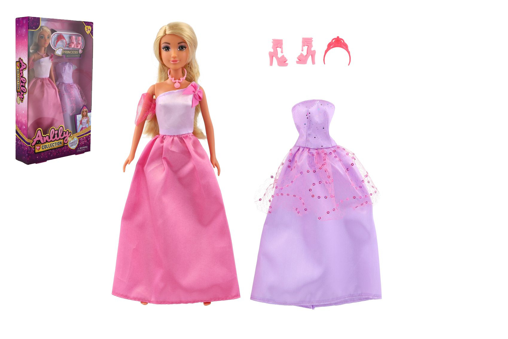 Panenka Anlily v roli půvabné princezny okouzlí každou malou milovnici pohádek. V balení najdete nejen samotnou panenku ve slavnostních šatech, ale také druhý šaty navíc, čelenku a jedny střevíce. Děti si tak mohou panenku převléknout a vtáhnout ji do světa vlastních příběhů plných kouzel a fantazie. Velikost panenky: 30 cm Rozměr balení: 19 × 32 × 5 cm Vhodné pro děti od 3 let