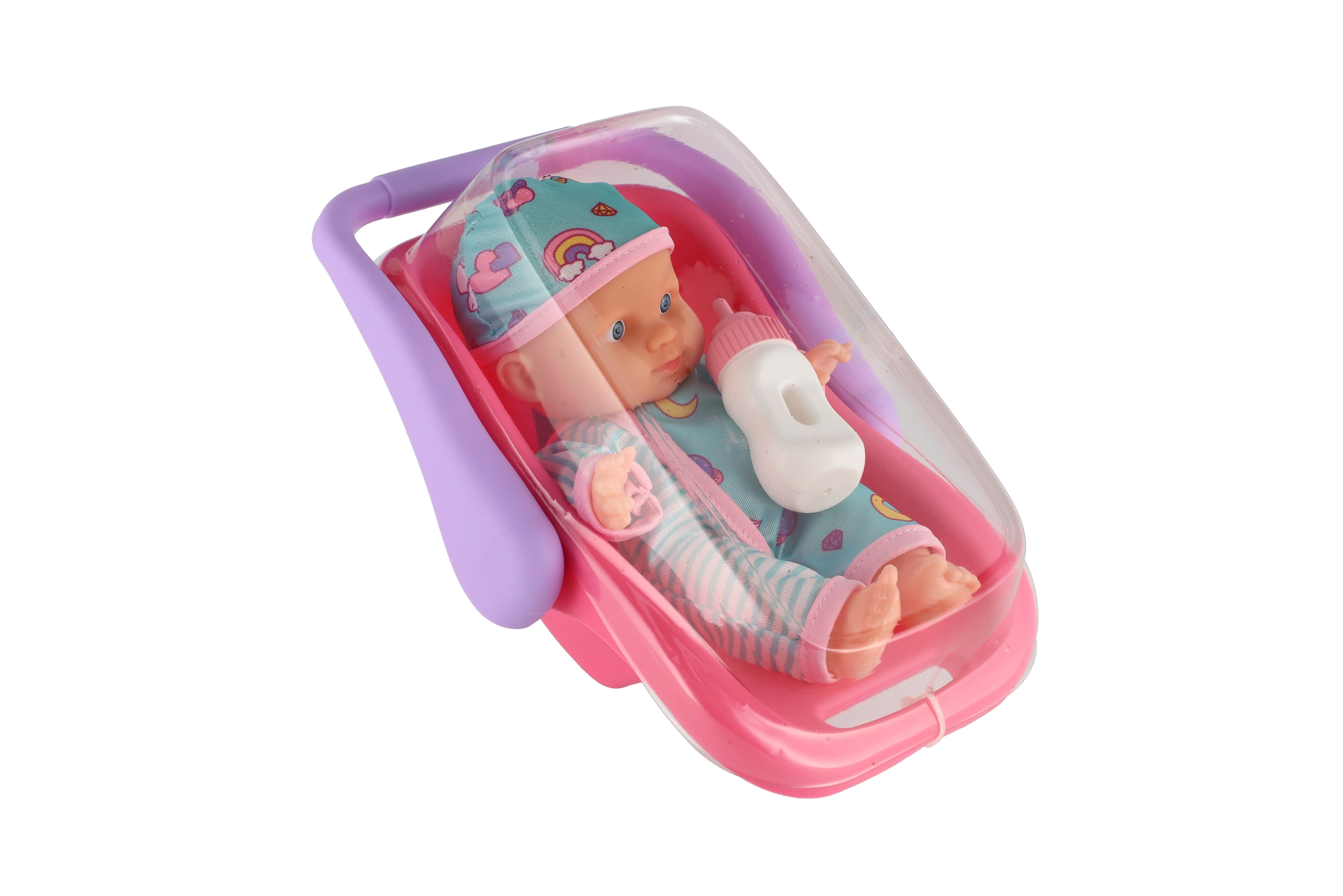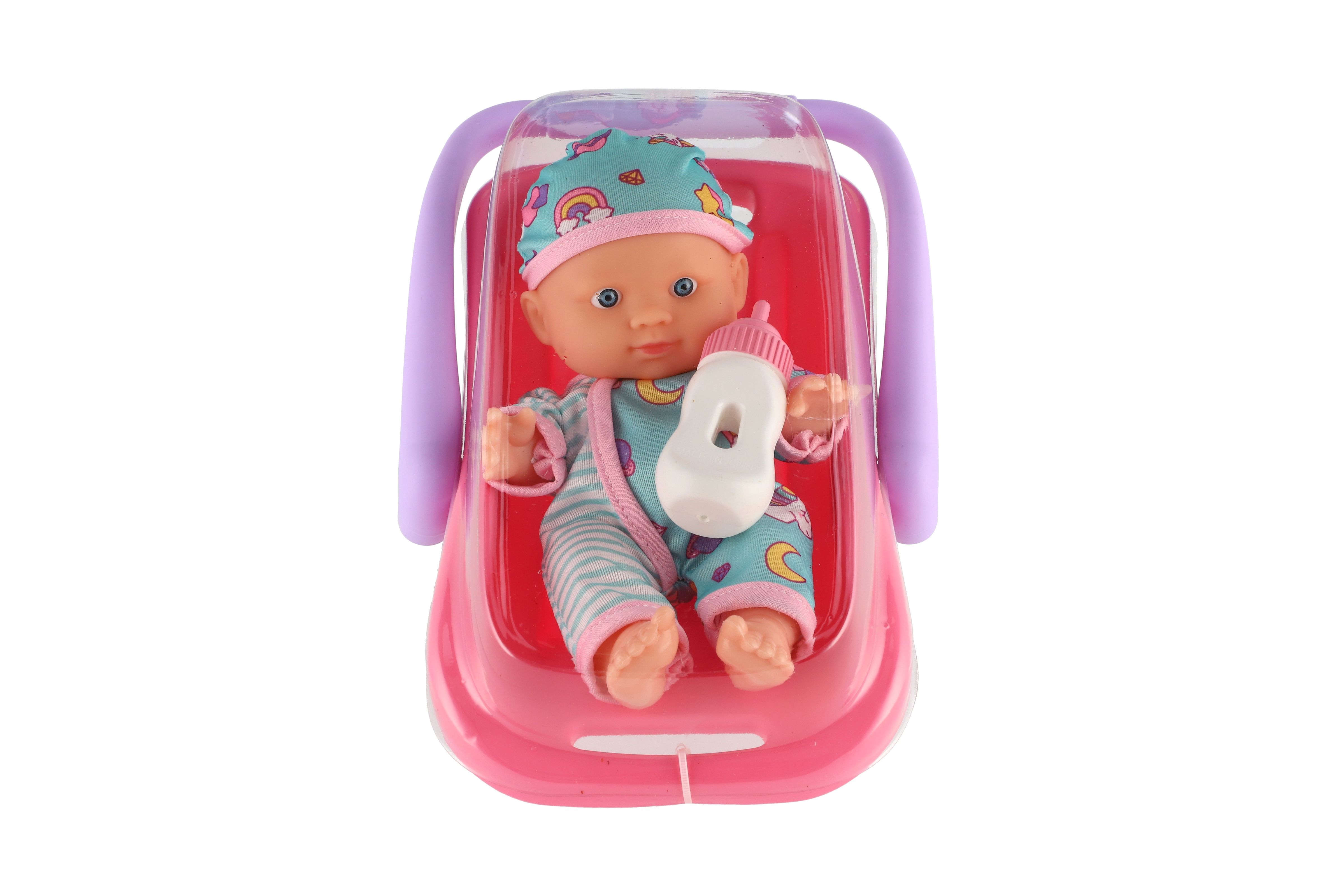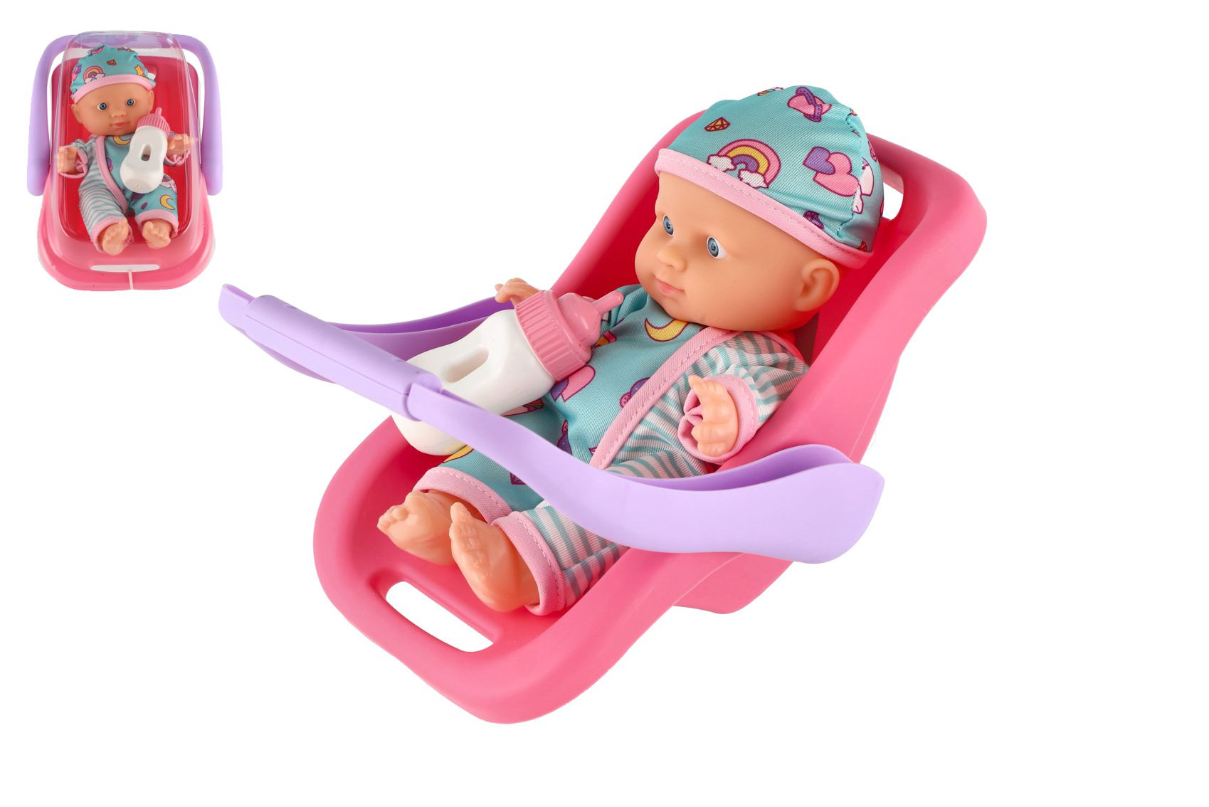 Panenka miminko 20 cm plast v nosítku/autosedačce s lahvičkou v blistru