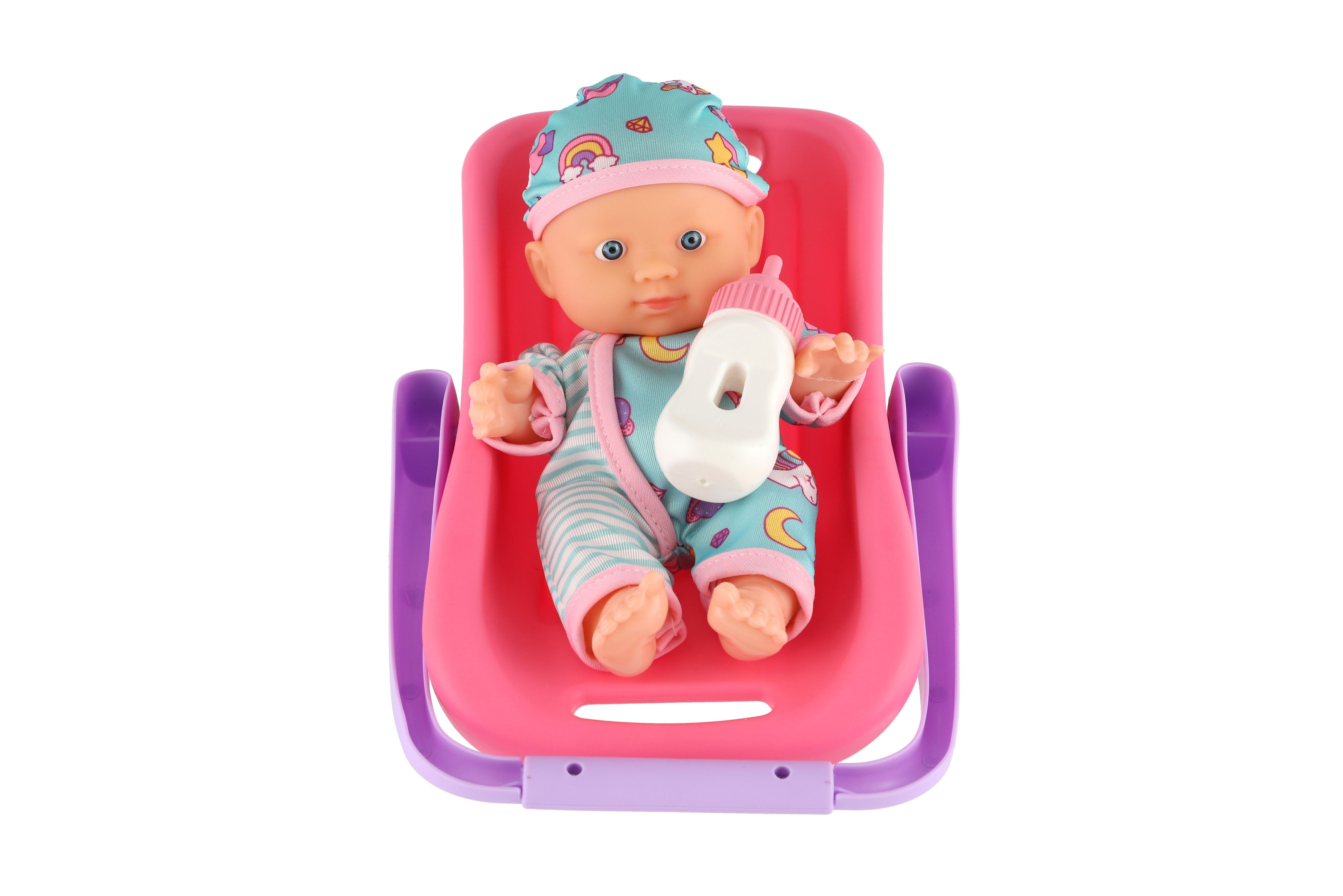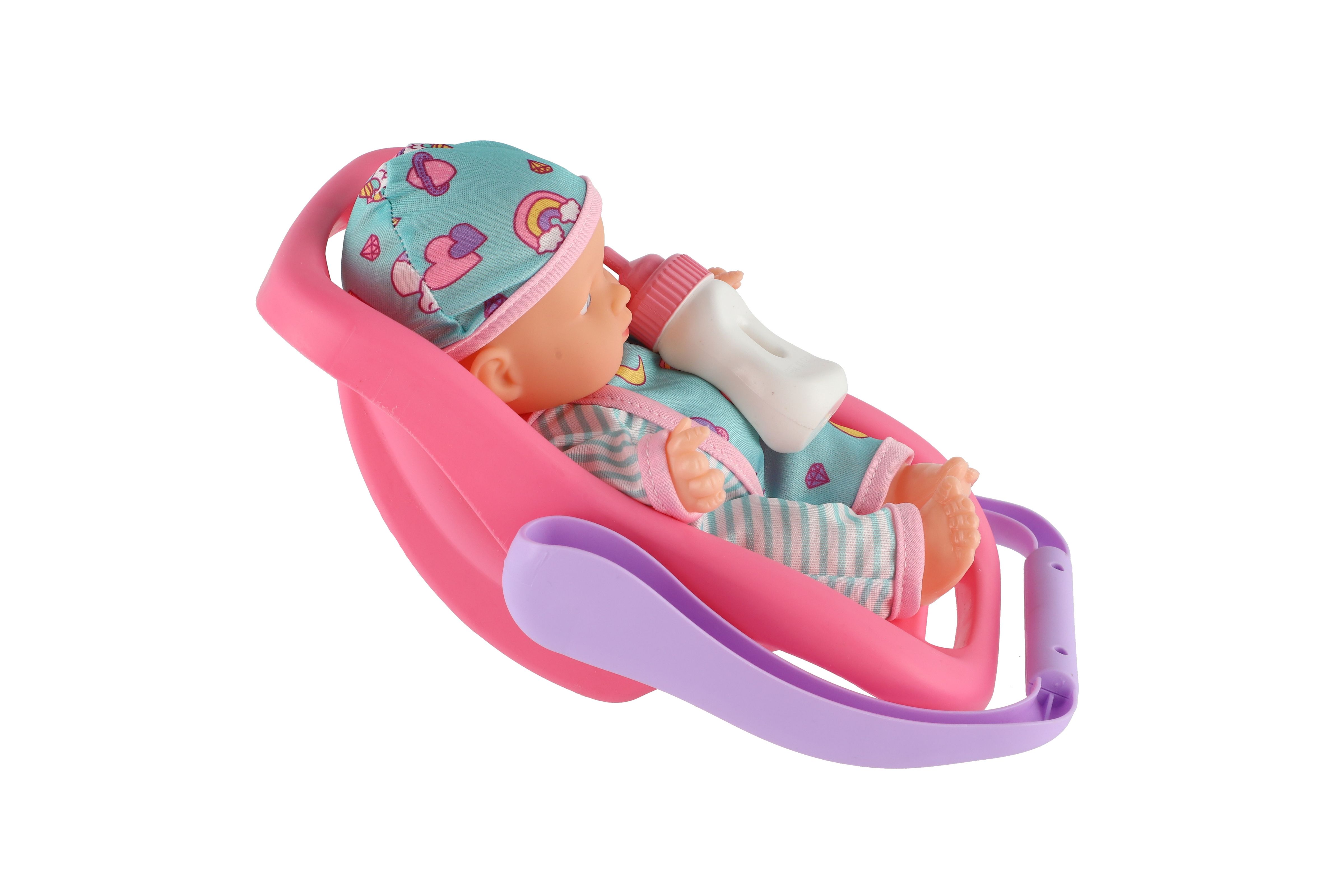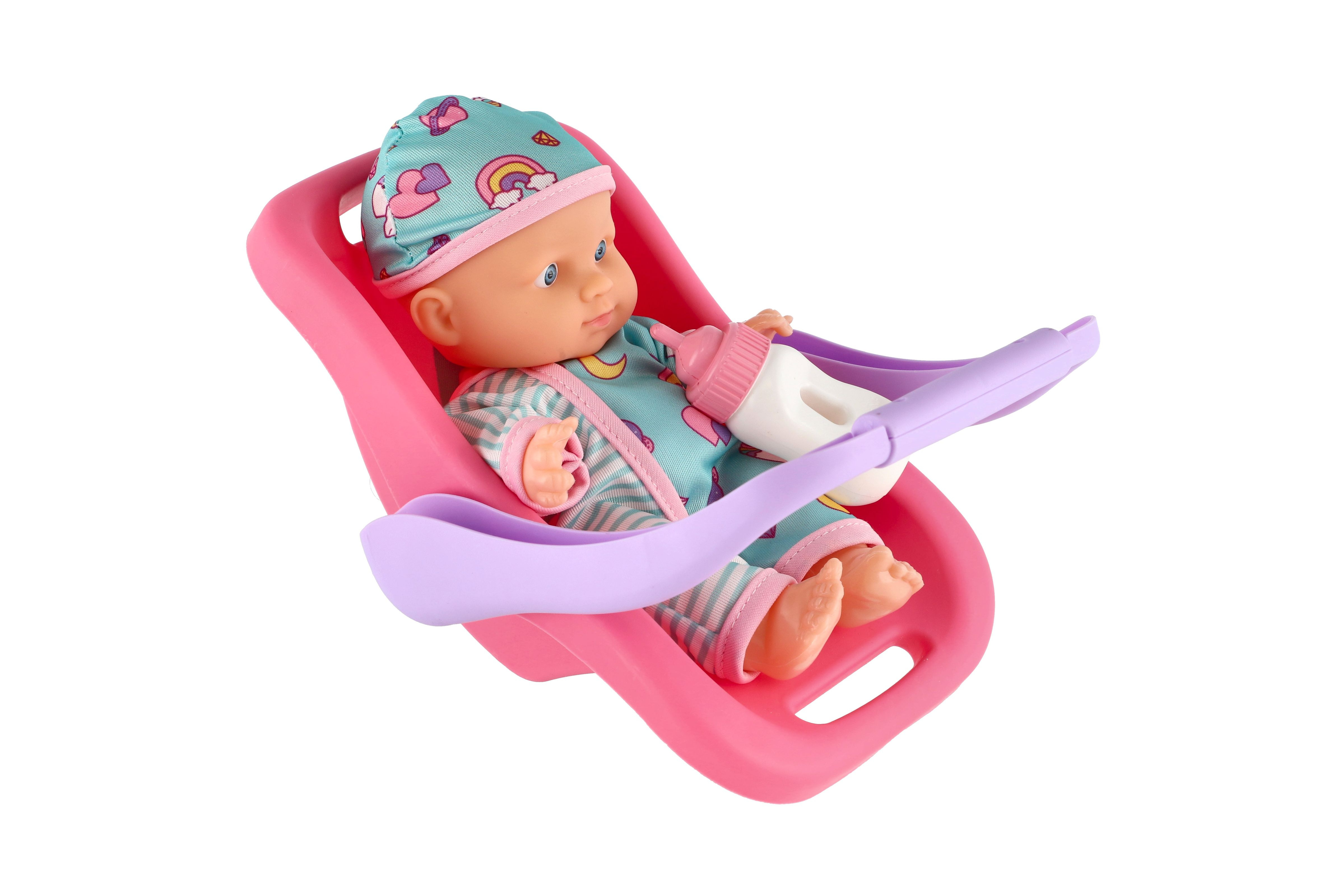 Panenka miminko 20 cm plast v nosítku/autosedačce s lahvičkou v blistru