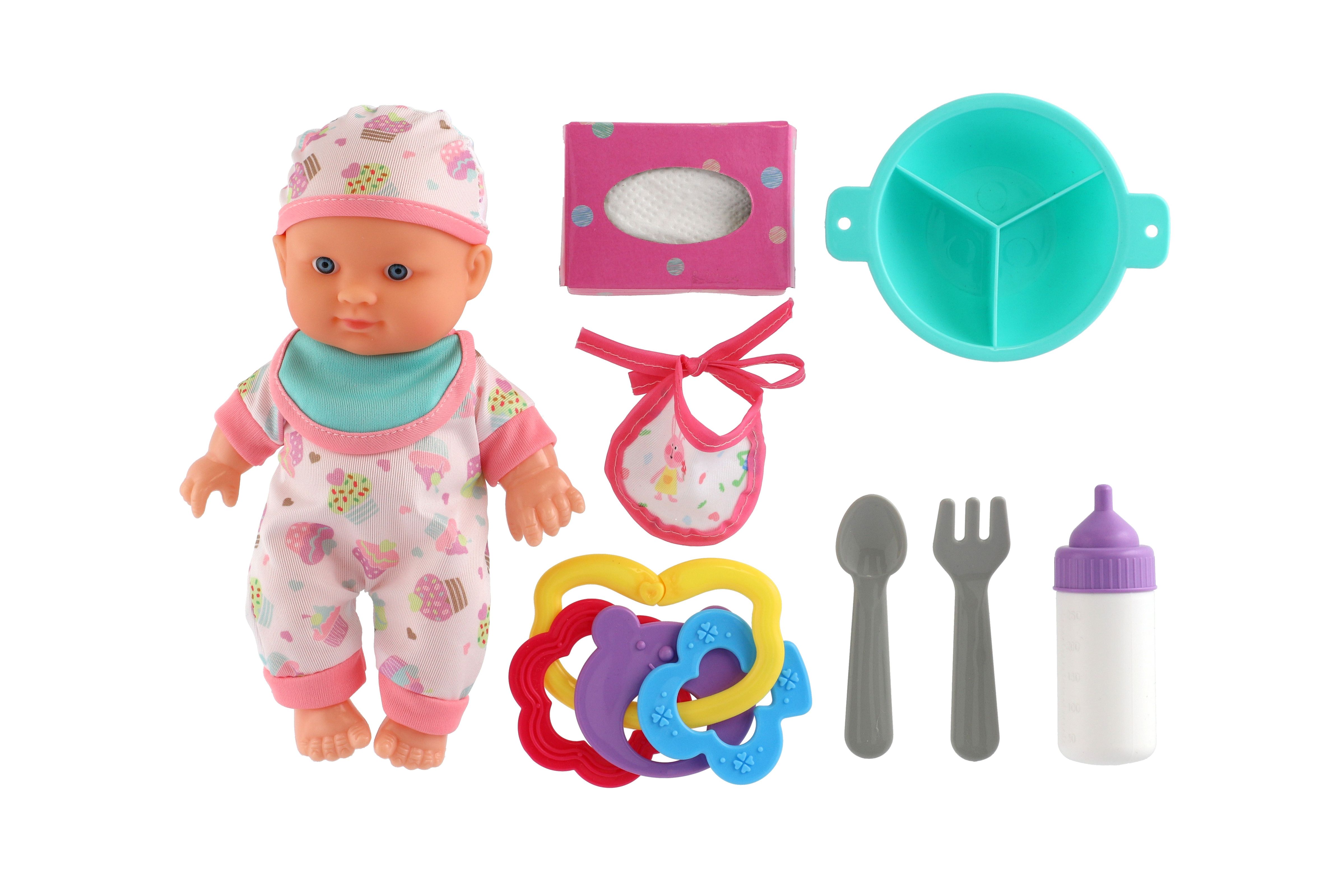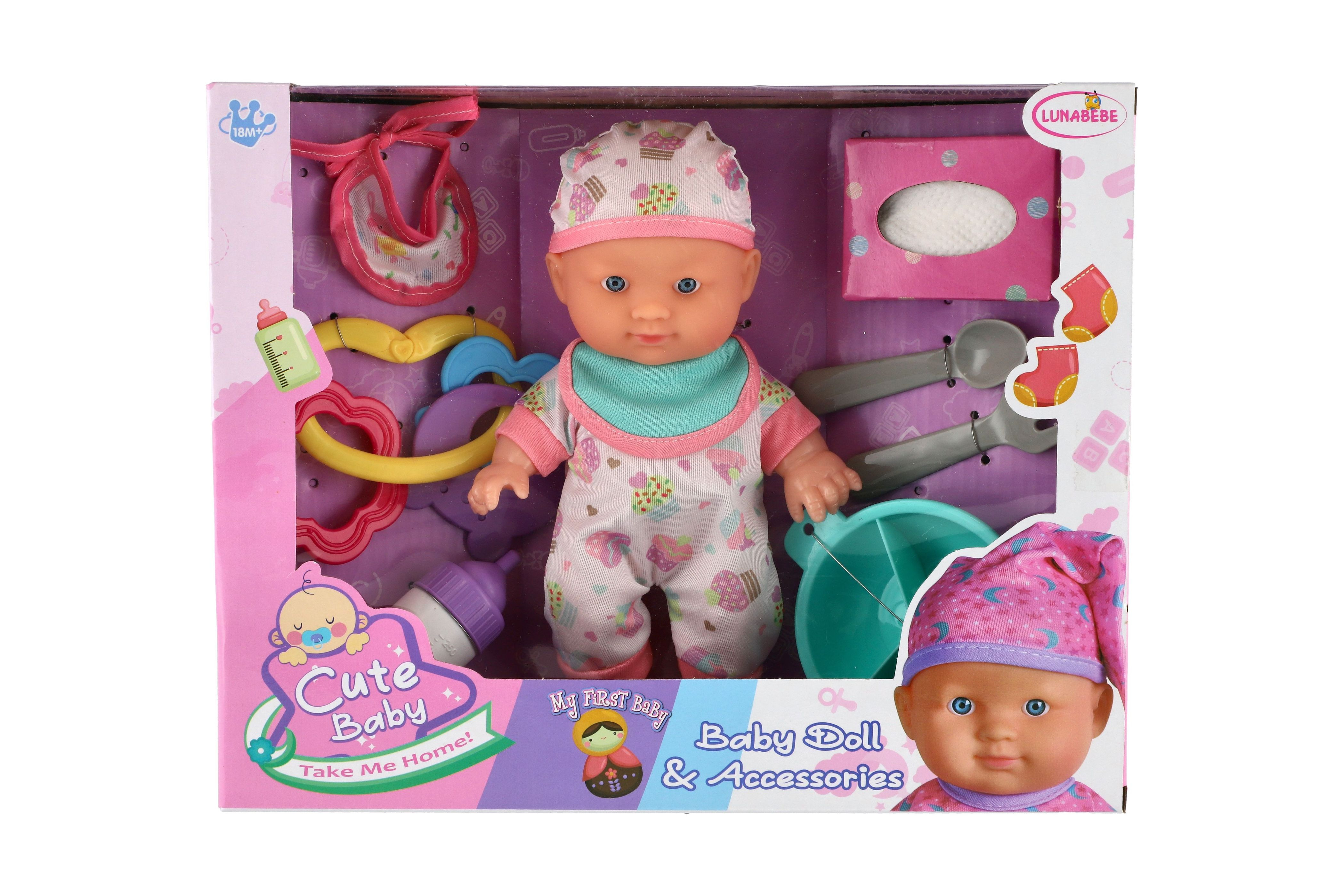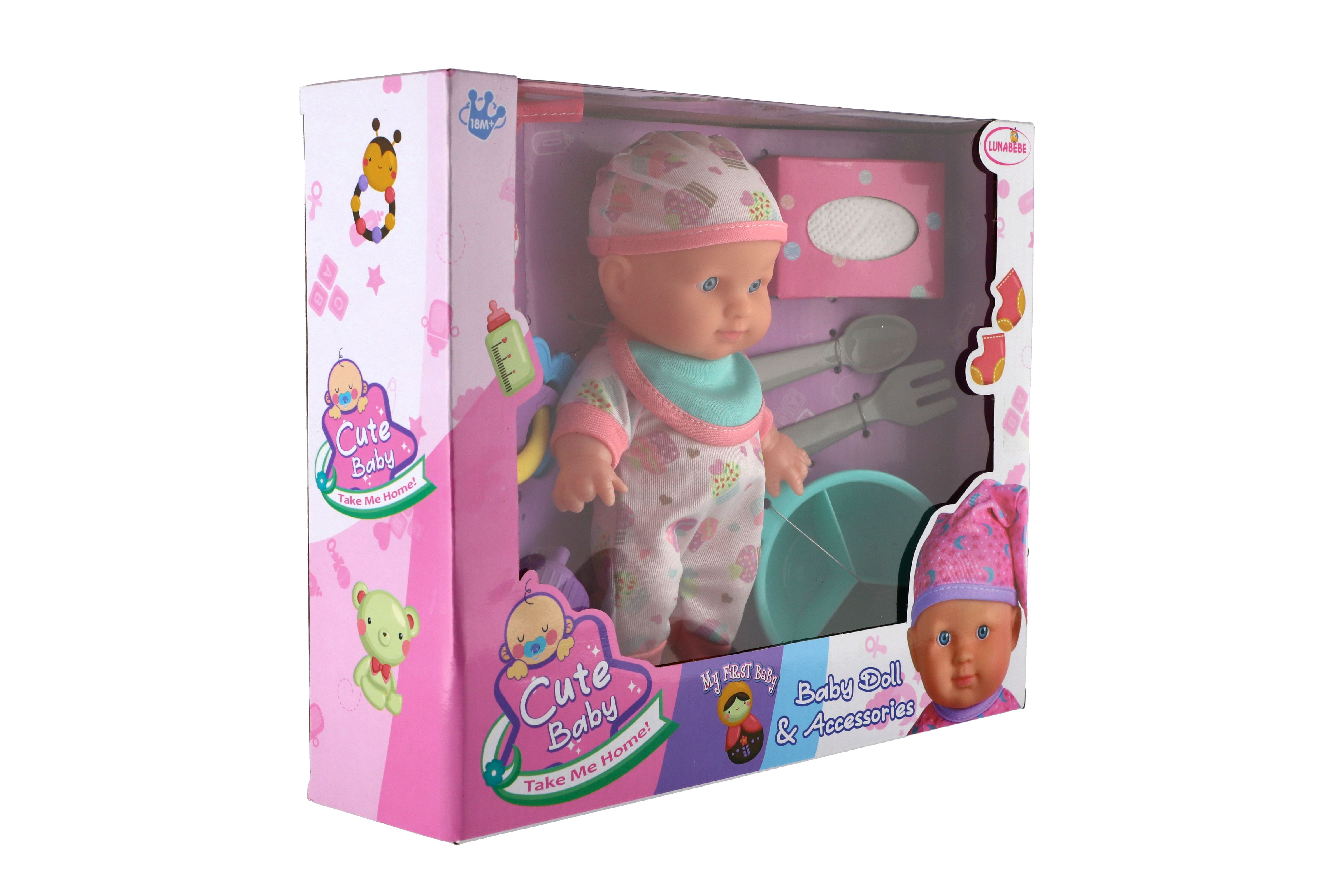 Panenka miminko 22cm pevné tělo plast s doplňky v krabici 30x24x8cm