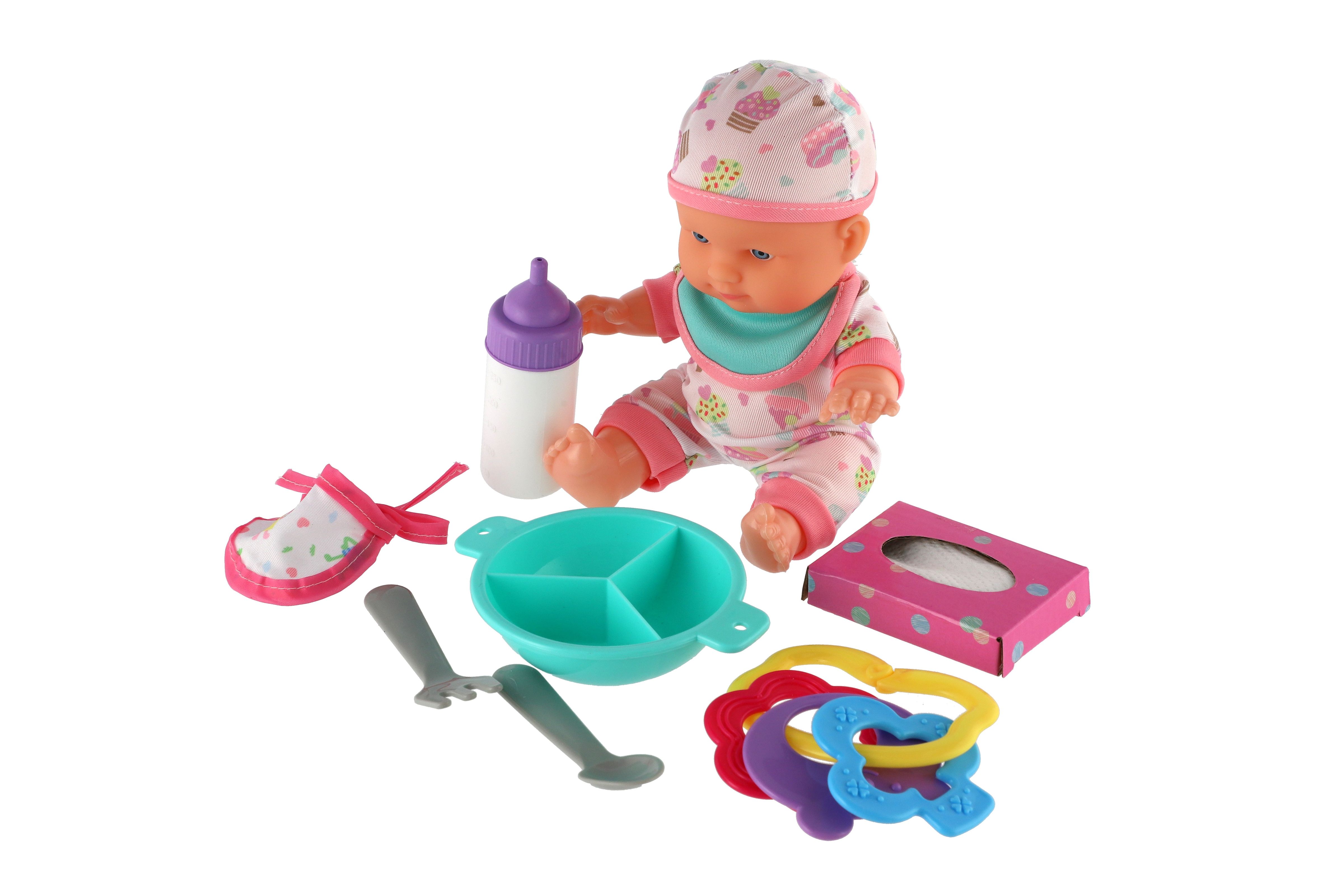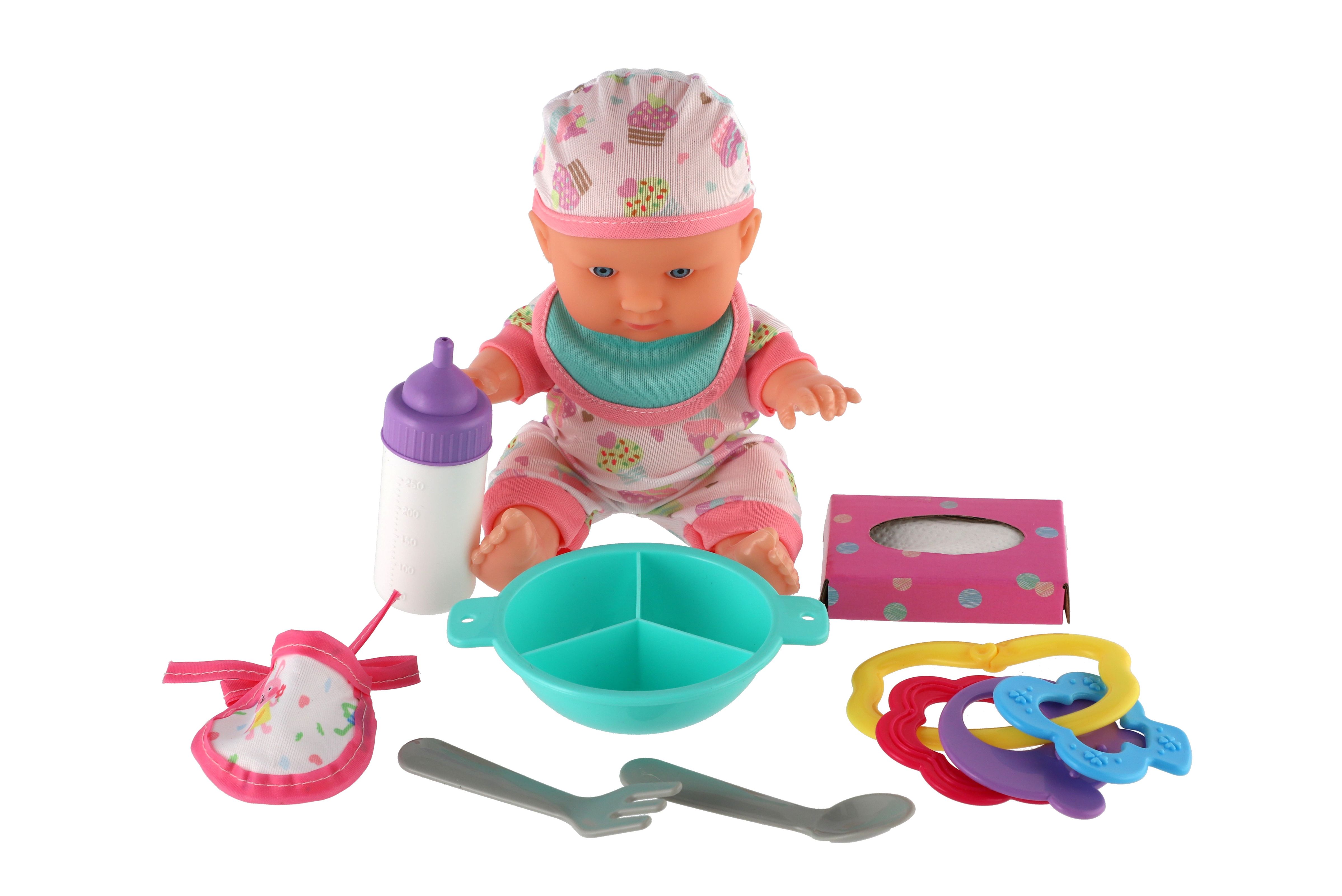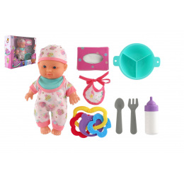 Roztomilá panenka s pevným telíčkem. Toto miminko udělá jistě radost každé holčičce a stane se tak její nepostradatelnou součástí. Součástí balení je lahvička, chrastítko, obrousky a jídelní set pro batolata, které určitě každá maminka pro své miminko nutně potřebuje. Velikost panenky: 22 cm Rozměr balení: 30 x 24 x 8 cm. Vhodné pro děti od 3 let.