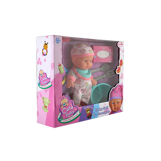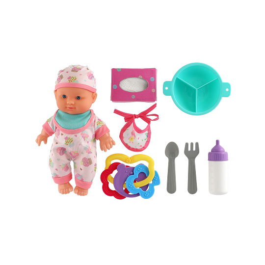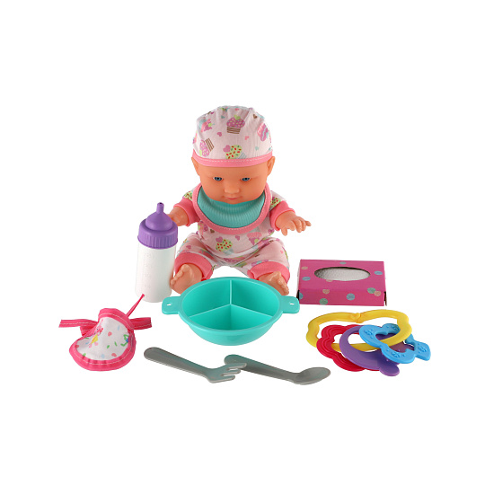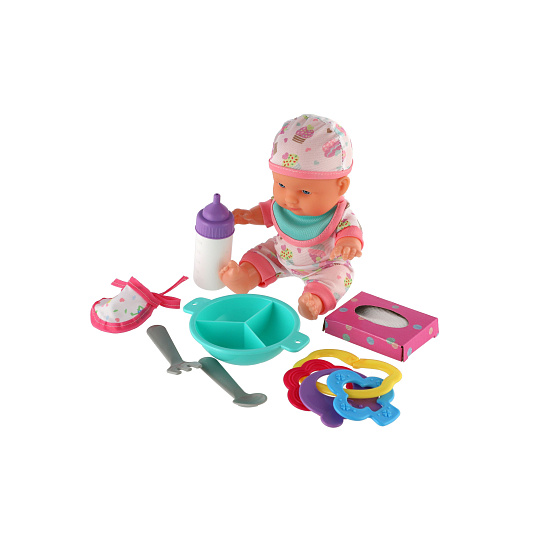 Roztomilá panenka s pevným telíčkem. Toto miminko udělá jistě radost každé holčičce a stane se tak její nepostradatelnou součástí. Součástí balení je lahvička, chrastítko, obrousky a jídelní set pro batolata, které určitě každá maminka pro své miminko nutně potřebuje. Velikost panenky: 22 cm Rozměr balení: 30 x 24 x 8 cm. Vhodné pro děti od 3 let.
