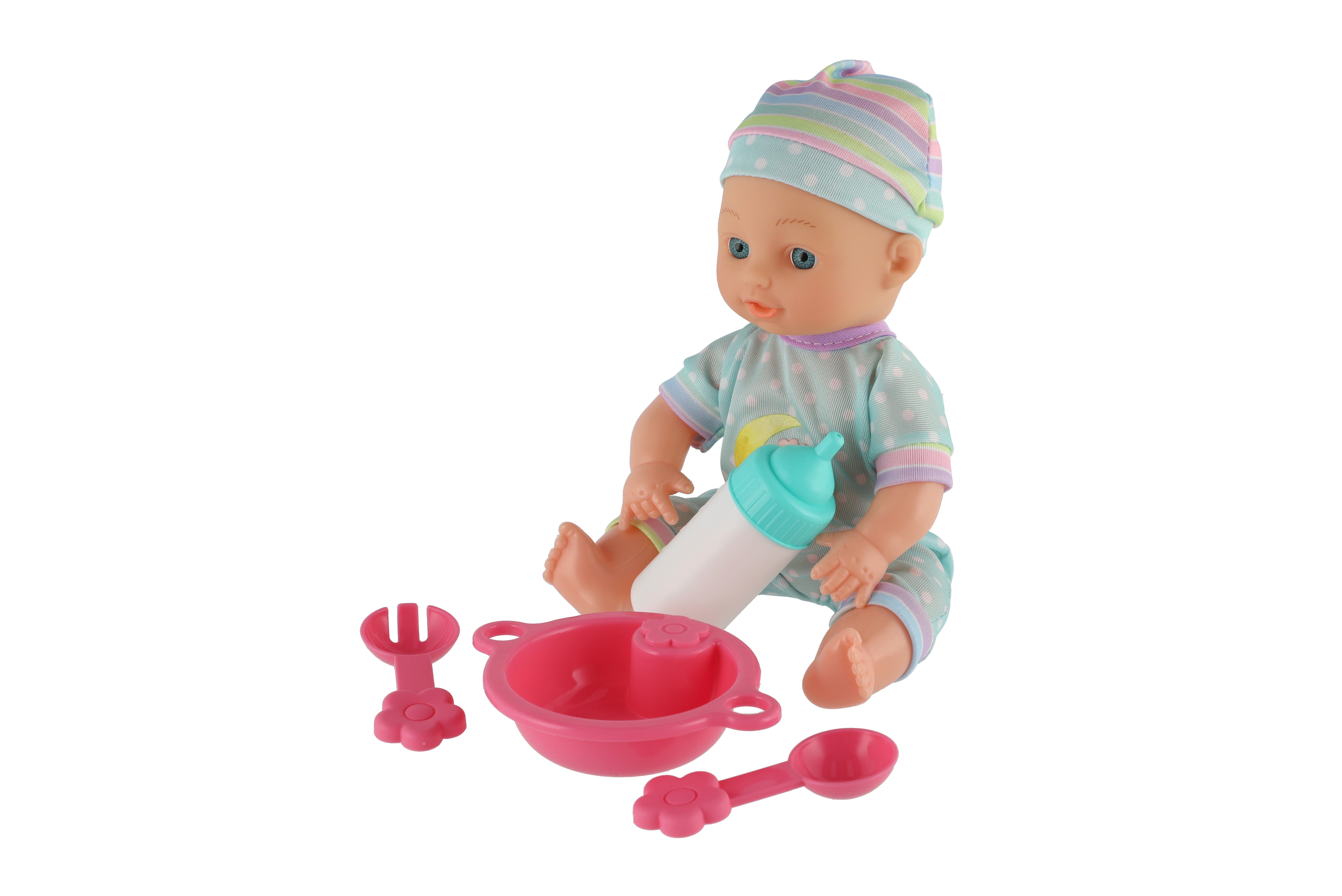 Roztomilá panenka s pevným telíčkem. Toto miminko udělá jistě radost každé holčičce a stane se tak její nepostradatelnou součástí. Součástí balení je jídelní set pro batolata, které určitě každá maminka pro své miminko nutně potřebuje. Velikost panenky: 25 cm Rozměr balení: 30 x 27 x 8 cm Vhodné pro děti od 3 let