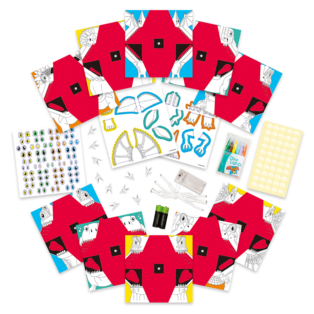 Obsah: 10 listů papírů s origami, 2 listy - částí těla dinosaurů, šňůra 10 LED světel s baterií, 2x AA baterie, 10 spon, 6 mini vláknových per, samolepka, lepící kruhy a průvodce