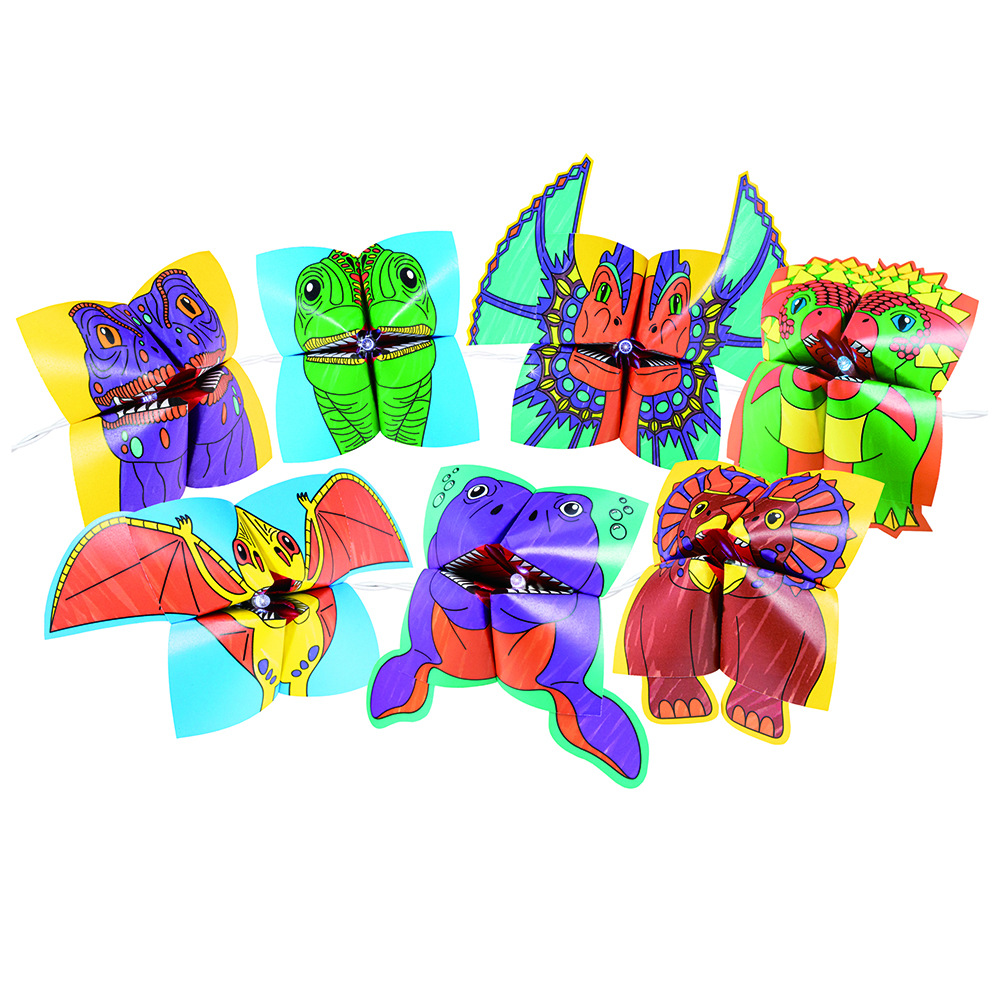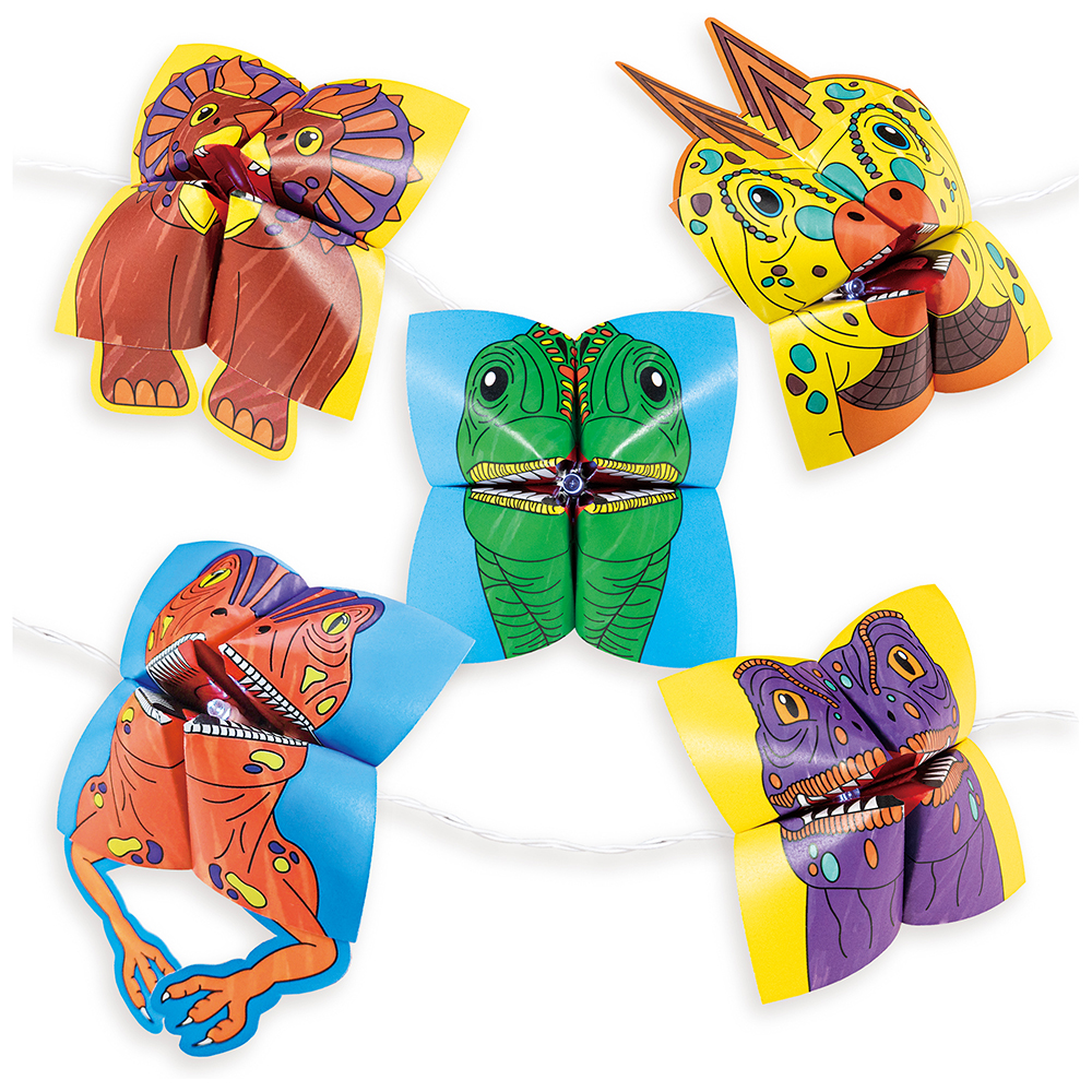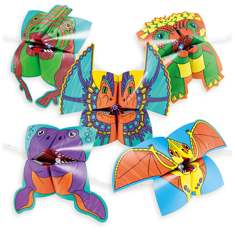 Řetěž rozjasní pokoj každého fanouška dinosaurů! Vybarvěte listy papíru z dinosauřích origami a podle pokynů krok za krokem je poskládejte. Poté přidejte samolepky, části těla a pomocí sponek je připevněte ke světlům pro prehistorickou světelnou show!