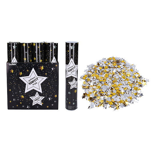 Wiky, Párty konfety vystřelovací Hvězdy 30 cm. Balení: 12 ks v display boxu. Dodržujte prosím všech instrukcí na etiketě. Nenechávejte děti bez dozoru, nemiřte do obličej, na tělo ani zvířata. Rozměry: 27,5 x 5 cm 10g zlatých a stříbrných hvězdiček