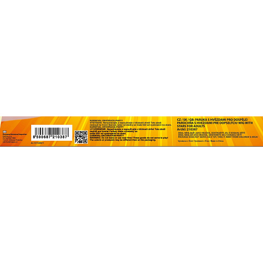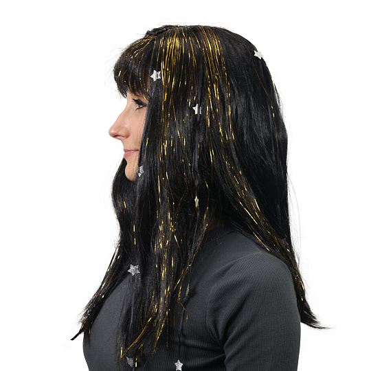 Karnevalová paruka v černé barvě je zdobená zlatými vlásky a stříbrnýma hvězdičkama. Perfektní doplněk na karneval nebo párty!