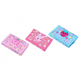 Peněženka na suchý zip 12,5x25 cm. 3 různé druhy. Modrá peněženka s jahodou. Růžová peněženka s koblihou. Červená peněženka se zajícem.