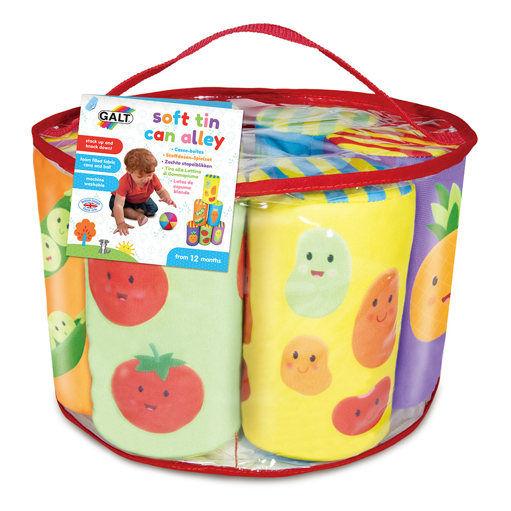 Sada 6 pěnových plechovek s rolničkami. Tyto měkké, barevné plechovky umožňují dítěti procvičit základy rovnováhy a při srážení plechovek míčkem mu zaručeně rozzáří úsměv na tváři.