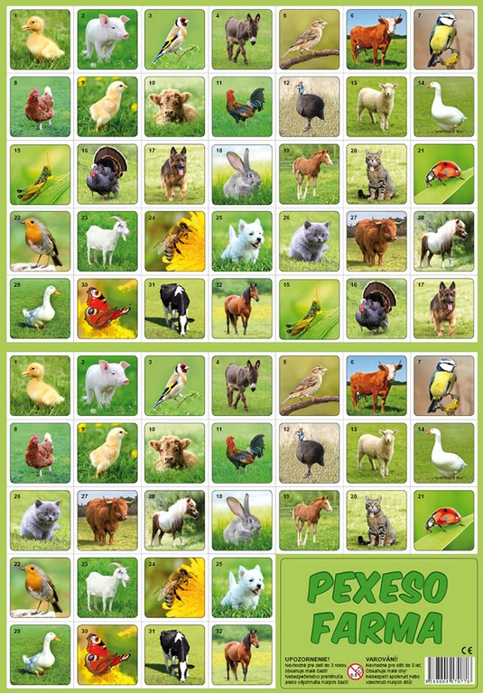 Společenská hra, při které si děti hravou formou trénují svou paměť. Hra se po rozstříhání skládá z 32 obrázkových dvojic. Pexeso 32 dvojic s obrázky zvířátek domácí farmy.