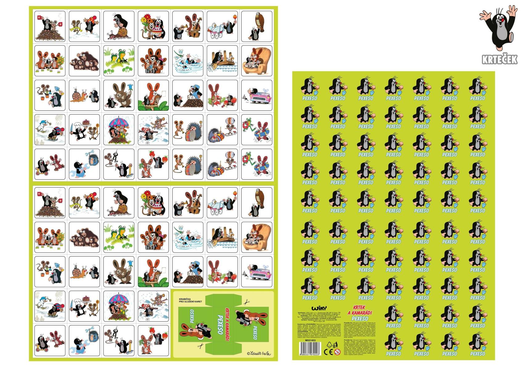 Krtek Pexeso vystřihovací, Krtek a kamarádi. 32 párů. Na archu krabička k vystřižení. Rozměry jednotlivých kartiček 48x48 mm. Papír 400g