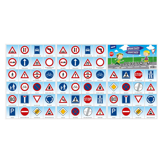 PEXESO je populární dětská stolní hra, která nikdy neomrzí a zapojit se můžou i dospělí. Pexeso - Dopravní značky. Vhodné pro děti, které se chtějí naučit poznávat dopravní značky, které na hodinách autoškoly budou umět s přehledem. Věděli jste, že slovo PEXESO vzniklo souslovím slov PEKELNĚ SE SOUSTŘEĎ? Výborná učební pomůcka pro děti a rodiče. Naučte své děti poznávat nová slovíčka a procvičujte jejich paměť. Tato hra je zabaví na dlouhé hodiny.Pexeso se skládá ze tří A4, na kterých najdete 64 kartiček s obrázky dopravních značek a návod ke hře - kartičky jsou s českými i slovenskými názvy.NÁVOD KE HŘE PEXESO:Pexeso mohou hrát nejméně dva hráči. Všechny rozstříhané kartičky zamíchají a rozloží obrázkem dolů do čtverce 8 x 8 kartiček. Nesmí se při tom dívat na obrázek. Hráči si určí pořadí hry. Hráč otočí dvě libovolné kartičky tak, aby si i ostatní spoluhráči mohli obrázky a jejich umístění zapamatovat. Pokud nemají kartičky stejné obrázky, otočí je a vrátí na původní místo. Pokračuje další hráč, který je na řadě. Jestliže objeví stejné obrázky, získává bod a obě kartičky vyřadí ze hry. Pokračuje do té chvíle, kdy otočí dva různé obrázky. Vyhrává hráč, který získá více bodů.PAPÍR: křída matná 350g + lamino lesk 1/1VELIKOST HRACÍCH KARET: 51x51cmVAROVÁNÍ:Nevhodné pro děti do 3 let. Nebezpečí vdechnutí a spolknutí malých částic.Uvedená cena je za 1 ks.