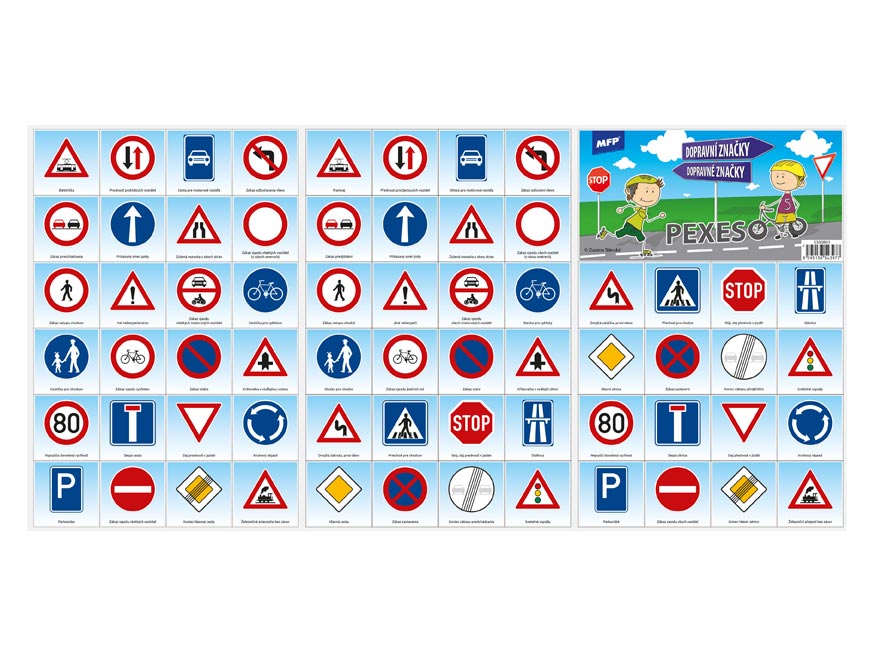 PEXESO je populární dětská stolní hra, která nikdy neomrzí a zapojit se můžou i dospělí. Pexeso - Dopravní značky. Vhodné pro děti, které se chtějí naučit poznávat dopravní značky, které na hodinách autoškoly budou umět s přehledem. Věděli jste, že slovo PEXESO vzniklo souslovím slov PEKELNĚ SE SOUSTŘEĎ? Výborná učební pomůcka pro děti a rodiče. Naučte své děti poznávat nová slovíčka a procvičujte jejich paměť. Tato hra je zabaví na dlouhé hodiny.Pexeso se skládá ze tří A4, na kterých najdete 64 kartiček s obrázky dopravních značek a návod ke hře - kartičky jsou s českými i slovenskými názvy.NÁVOD KE HŘE PEXESO:Pexeso mohou hrát nejméně dva hráči. Všechny rozstříhané kartičky zamíchají a rozloží obrázkem dolů do čtverce 8 x 8 kartiček. Nesmí se při tom dívat na obrázek. Hráči si určí pořadí hry. Hráč otočí dvě libovolné kartičky tak, aby si i ostatní spoluhráči mohli obrázky a jejich umístění zapamatovat. Pokud nemají kartičky stejné obrázky, otočí je a vrátí na původní místo. Pokračuje další hráč, který je na řadě. Jestliže objeví stejné obrázky, získává bod a obě kartičky vyřadí ze hry. Pokračuje do té chvíle, kdy otočí dva různé obrázky. Vyhrává hráč, který získá více bodů.PAPÍR: křída matná 350g + lamino lesk 1/1VELIKOST HRACÍCH KARET: 51x51cmVAROVÁNÍ:Nevhodné pro děti do 3 let. Nebezpečí vdechnutí a spolknutí malých částic.Uvedená cena je za 1 ks.