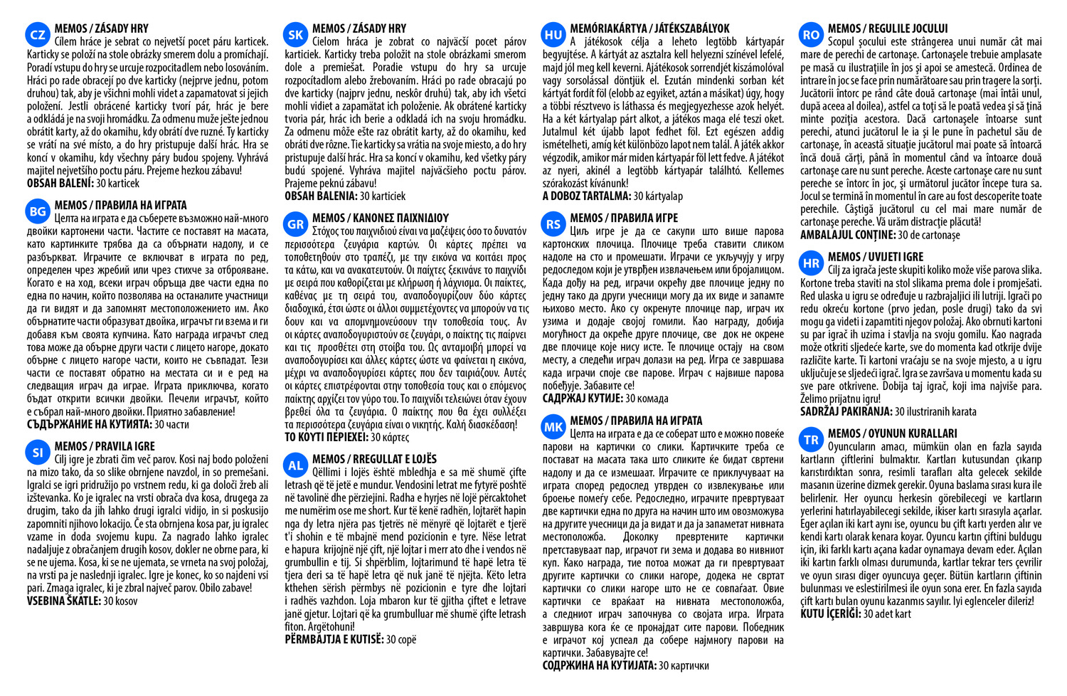 Klasická hra pro všechny věkové kategorie. Rozvíjející paměť a soustředění. Cílem hráčů je najít co nejvíce stejných dvojic. Kartičky jsou vyrobeny z kvalitního pevného kartonu, který zaručuje dlouhou životnost. Věk: 4+