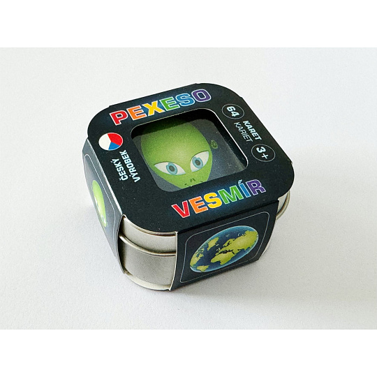Originální pexeso v malé plechové krabičce s krásně ilustrovanými obrázky z vesmíru. Kartičky jsou vyrobeny z kvalitního karetního kartonu se speciálním karetním lakem, který zaručí opravdu dlouhou životnost kartiček. Plechová krabička obsahuje 64 karet. Rozměr krabičky: 6 x 6 x 4 cm. Vhodné pro děti od 3 let