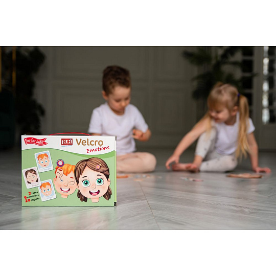 Naučná skládačka pro děti od 12 měsíců.\n2 pružné plastové destičky se suchým zipem, 20 samostatných dílků a 6 karet emočních výrazů, Poskládejte a poznejte výrazy tváře a trénujte svou emoční inteligenci. Zjistěte více o vlastních emocích a pokuste se uhodnout co cítí vaší blízcí nebo kamarádi. které umístíte na desti... více