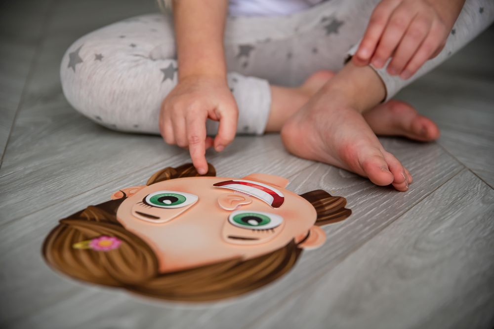 Naučná skládačka pro děti od 12 měsíců.\n2 pružné plastové destičky se suchým zipem, 20 samostatných dílků a 6 karet emočních výrazů, Poskládejte a poznejte výrazy tváře a trénujte svou emoční inteligenci. Zjistěte více o vlastních emocích a pokuste se uhodnout co cítí vaší blízcí nebo kamarádi. které umístíte na destičky pomocí suchého zipu. Díky této vychytávce jednotlivé díly jen tak nespadnou.\n\nNaučná skládačka pro děti od 12 měsíců.\nPoskládejte a poznejte výrazy tváře a trénujte svou emoční inteligenci\n\nCO JE UVNITŘ?\nV krabičce najdete 2 plastové obličeje, 6 papírových karet s vyobrazením emocí a 20 dílů obličeje., které umístíte na destičky pomocí suchého zipu. Díky této vychytávce jednotlivé díly jen tak nespadnou a budou držet na správném místě. Všechny části jsou vyrobené z odolného, ale tenkého plastu se speciální povrchovou úpravou, která je dětem příjemná na dotek.\n\nJAK HRÁT?\nHra obsahuje několik karet s různými emocemi a dva obličeje - dívku a chlapce. Vezměte jednu kartu s vyobrazenou emocí a ukažte jí dítěti. Požádejte ho, aby pro výraz obličeje vybral odpovídající oči, ústa, nos a "přilepil" je pomocí suchého zipu na plastovou destičku s prázdným obličejem. Vyzkoušejte sami zopakovat výraz na své tváři a povzbuďte dítě aby udělalo to samé!\nPostupte na další úroveň Emoční Inteligence! \nPoproste dítě, aby našlo oči, nos a ústa pro přesně opačnou emoci, než je nakreslená na kartě. Proberte spolu s děckem nejemotivnější okažiky dnešního dne a řekněte si, při čem se takto cítilo. ...a co se Ti před tím stalo? Zkuste společně najít důvod.\n\nBENEFITY:\n- zlepšuje motorické schopnosti\n- trénuje vyjadřování a mluvenou řeč\n- rozvíjí myšlení a emoční inteligenci\n- upevňuje udržení pozornosti\n\nPoskládejte a poznejte výrazy tváře a trénujte svou emoční inteligenci. Zjistěte více o vlastních emocích a pokuste se uhodnout co cítí vaší blízcí nebo kamarádi. \n\nVyzkoušejte si také jednotlivé emoce přímo na svojí tváři. Daří se to?\n- Údiv\n- Hněv\n- Radost\n- Smích\n- Smutek\n- Znechucení