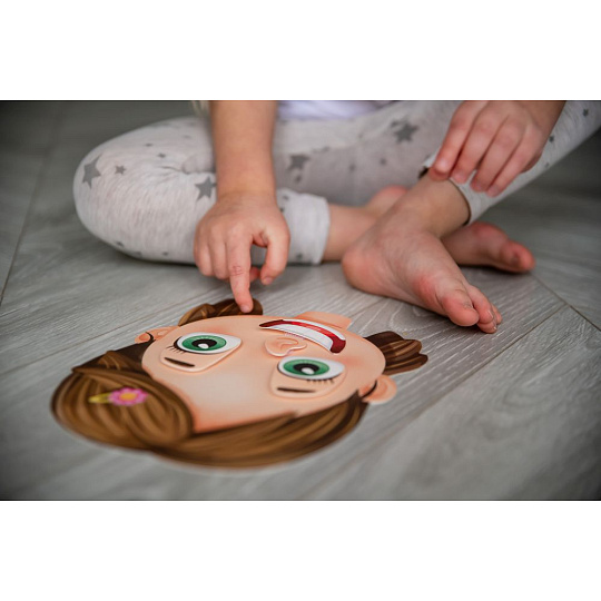 Naučná skládačka pro děti od 12 měsíců.\n2 pružné plastové destičky se suchým zipem, 20 samostatných dílků a 6 karet emočních výrazů, Poskládejte a poznejte výrazy tváře a trénujte svou emoční inteligenci. Zjistěte více o vlastních emocích a pokuste se uhodnout co cítí vaší blízcí nebo kamarádi. které umístíte na destičky pomocí suchého zipu. Díky této vychytávce jednotlivé díly jen tak nespadnou.\n\nNaučná skládačka pro děti od 12 měsíců.\nPoskládejte a poznejte výrazy tváře a trénujte svou emoční inteligenci\n\nCO JE UVNITŘ?\nV krabičce najdete 2 plastové obličeje, 6 papírových karet s vyobrazením emocí a 20 dílů obličeje., které umístíte na destičky pomocí suchého zipu. Díky této vychytávce jednotlivé díly jen tak nespadnou a budou držet na správném místě. Všechny části jsou vyrobené z odolného, ale tenkého plastu se speciální povrchovou úpravou, která je dětem příjemná na dotek.\n\nJAK HRÁT?\nHra obsahuje několik karet s různými emocemi a dva obličeje - dívku a chlapce. Vezměte jednu kartu s vyobrazenou emocí a ukažte jí dítěti. Požádejte ho, aby pro výraz obličeje vybral odpovídající oči, ústa, nos a "přilepil" je pomocí suchého zipu na plastovou destičku s prázdným obličejem. Vyzkoušejte sami zopakovat výraz na své tváři a povzbuďte dítě aby udělalo to samé!\nPostupte na další úroveň Emoční Inteligence! \nPoproste dítě, aby našlo oči, nos a ústa pro přesně opačnou emoci, než je nakreslená na kartě. Proberte spolu s děckem nejemotivnější okažiky dnešního dne a řekněte si, při čem se takto cítilo. ...a co se Ti před tím stalo? Zkuste společně najít důvod.\n\nBENEFITY:\n- zlepšuje motorické schopnosti\n- trénuje vyjadřování a mluvenou řeč\n- rozvíjí myšlení a emoční inteligenci\n- upevňuje udržení pozornosti\n\nPoskládejte a poznejte výrazy tváře a trénujte svou emoční inteligenci. Zjistěte více o vlastních emocích a pokuste se uhodnout co cítí vaší blízcí nebo kamarádi. \n\nVyzkoušejte si také jednotlivé emoce přímo na svojí tváři. Daří se to?\n- Údiv\n- Hněv\n- Radost\n- Smích\n- Smutek\n- Znechucení