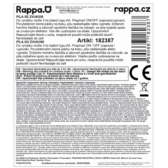 Plastová pila na baterie vydávající reálný zvuk. Má pohyblivý řetěz a její délka je cca 36 cm. Výrobek vyžaduje použití 3 ks baterií typu AA, které nejsou součástí.
