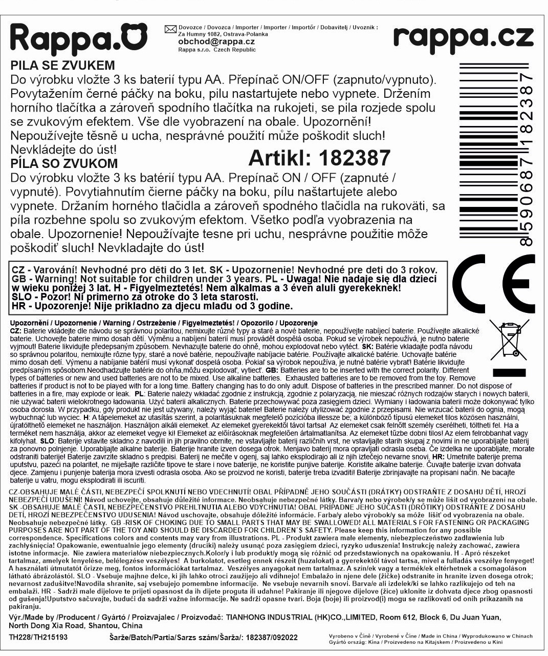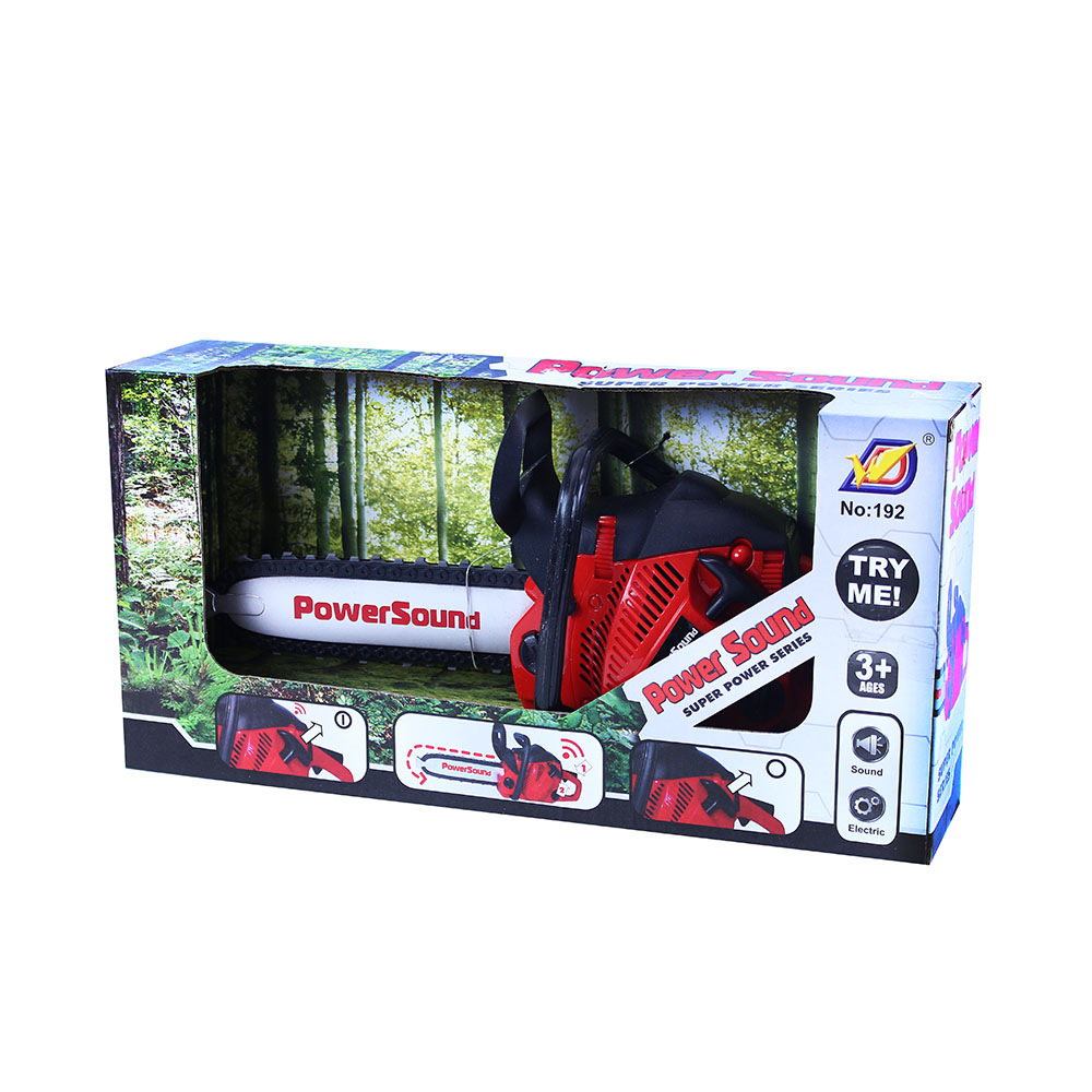Plastová pila na baterie vydávající reálný zvuk. Má pohyblivý řetěz a její délka je cca 36 cm. Výrobek vyžaduje použití 3 ks baterií typu AA, které nejsou součástí.