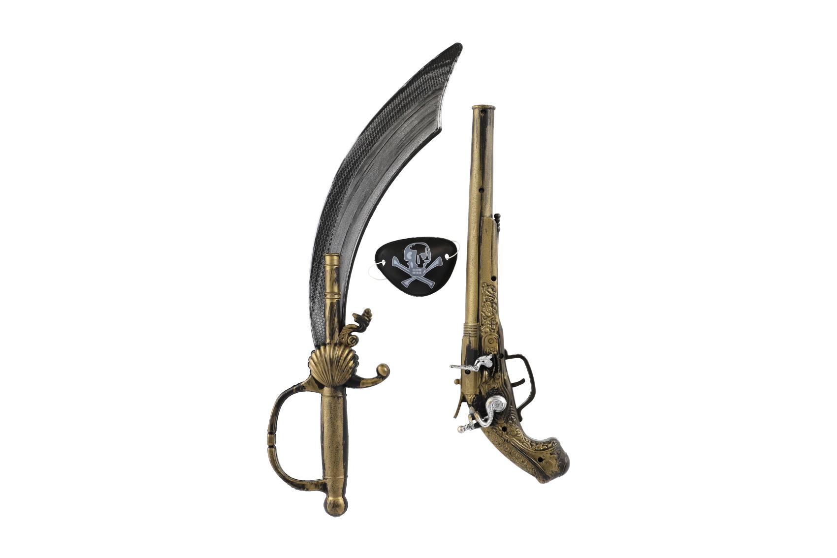 Vzhůru na palubu! Tato pirátská sada promění každého malého dobrodruha v neohroženého mořského vlka. Obsahuje nezbytné vybavení pro každého piráta – meč nebo šavli, klapací pistoli a pirátskou pásku přes oko. Ideální doplněk ke karnevalovému kostýmu, na narozeninovou párty nebo k hrám na piráty. Rozměry balení 19 x 53 x 5 cm Vhodné pro děti od 3 let