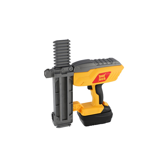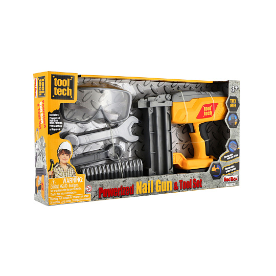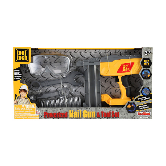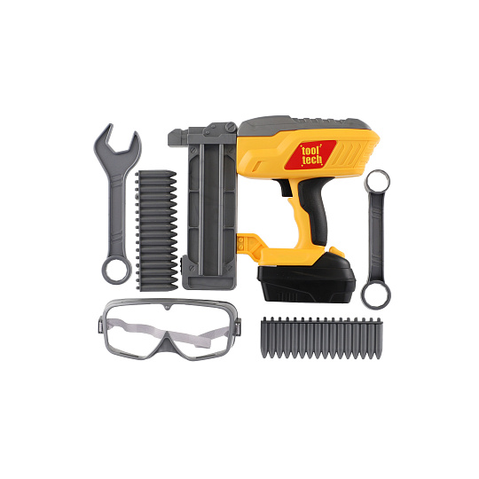 Nádherná sada pro malé kutily. Souprava obsahuje ochranné brýle, klíče, plastové náboje hřebíky a samozřejmě nastřelovací pistoli. Užijete si tak spoustu zábavy při drobných opravách. Pistole má vyjímatelný pack, kde jsou uloženy baterie. Baterie 2x AA jsou součástí balení. Rozměry balení 42 x 22 x 7 cm. Vhodné pro děti od 3 let.