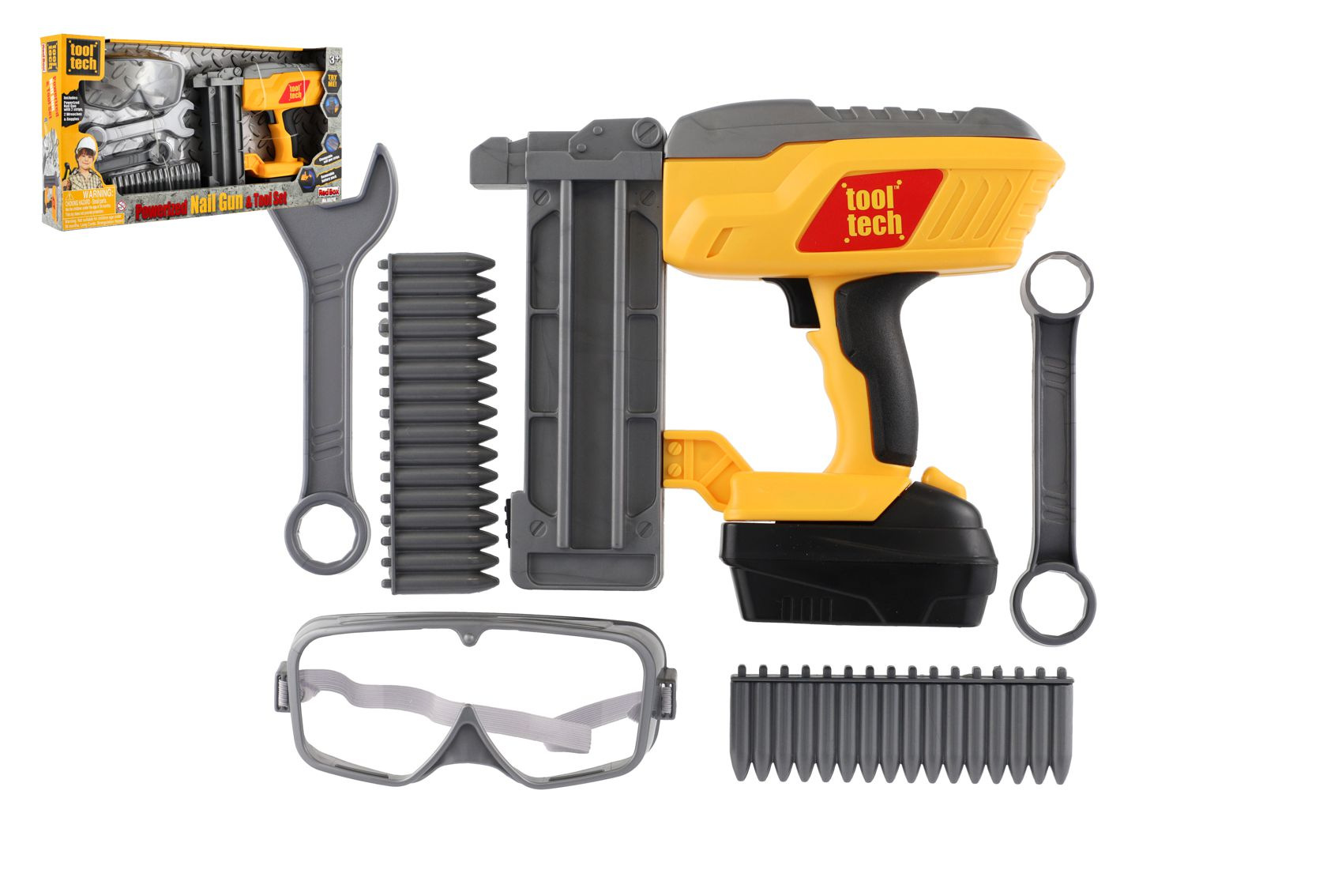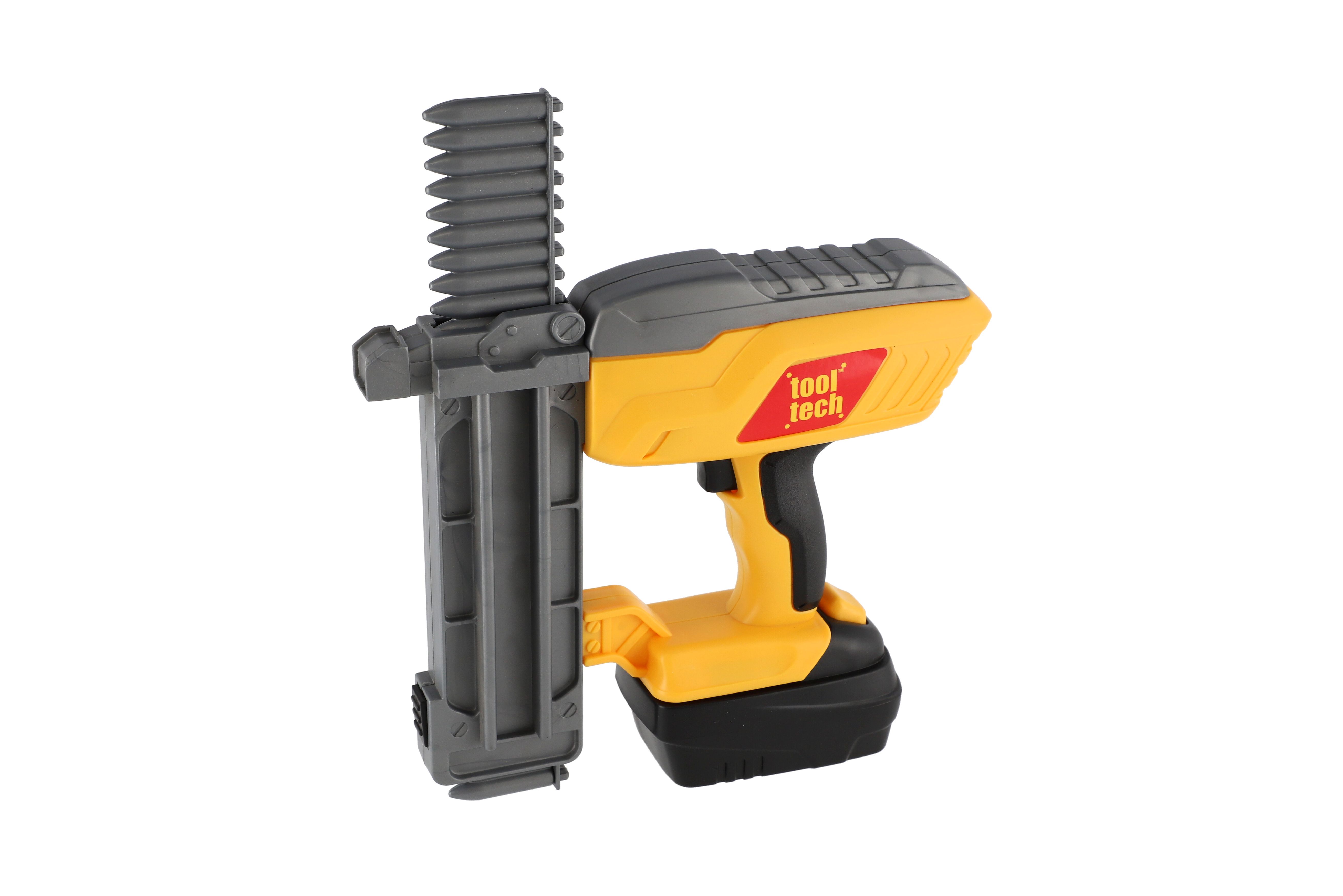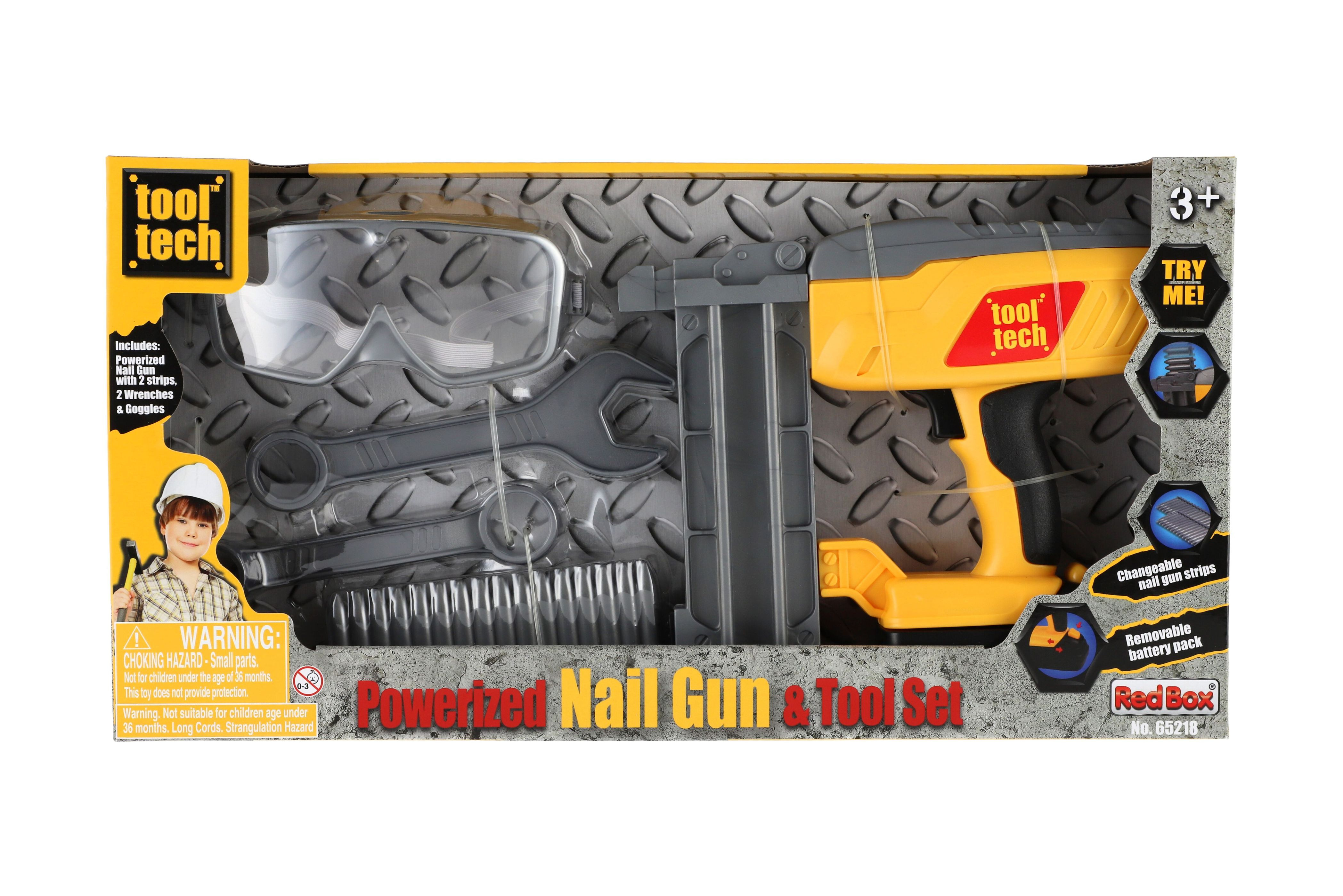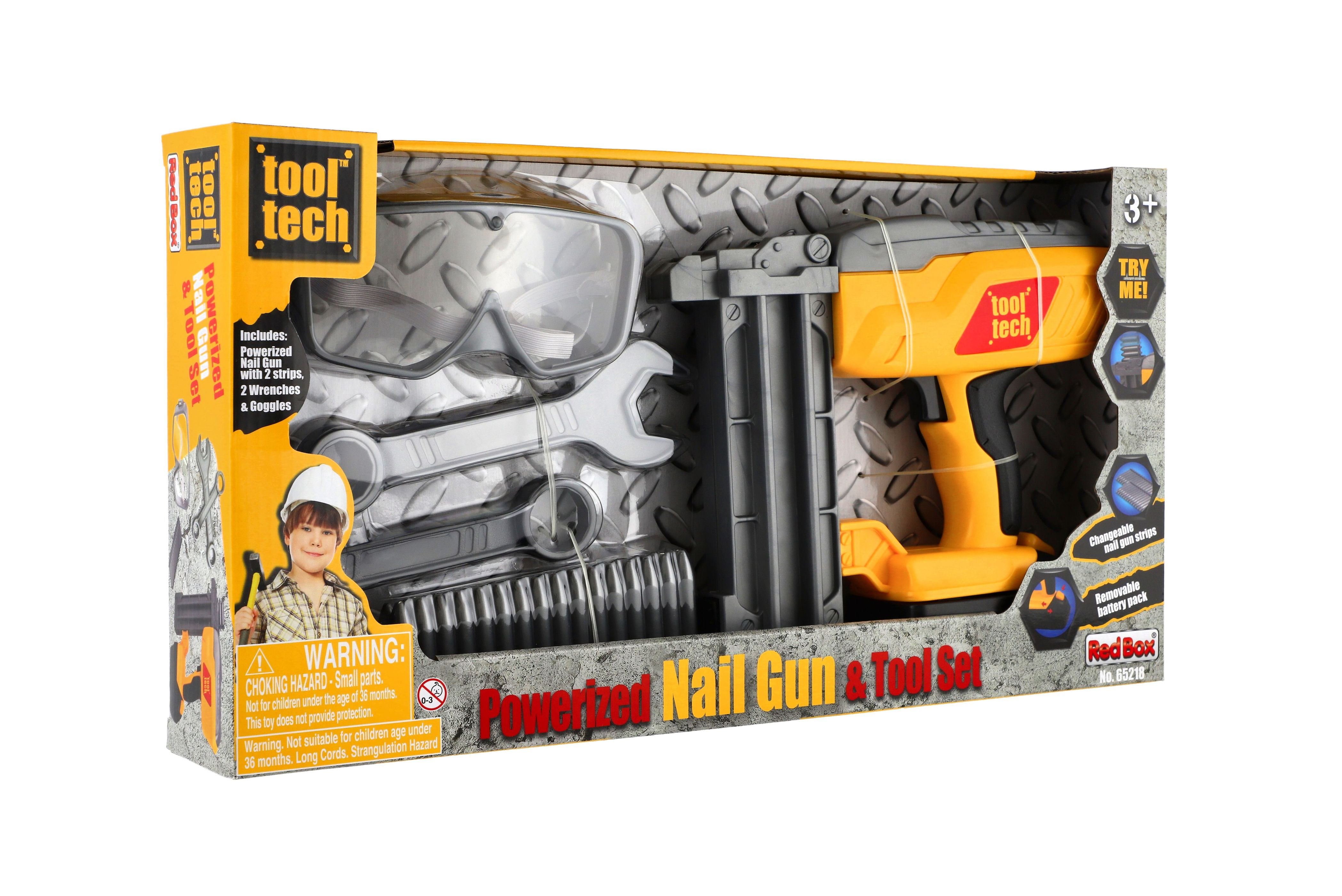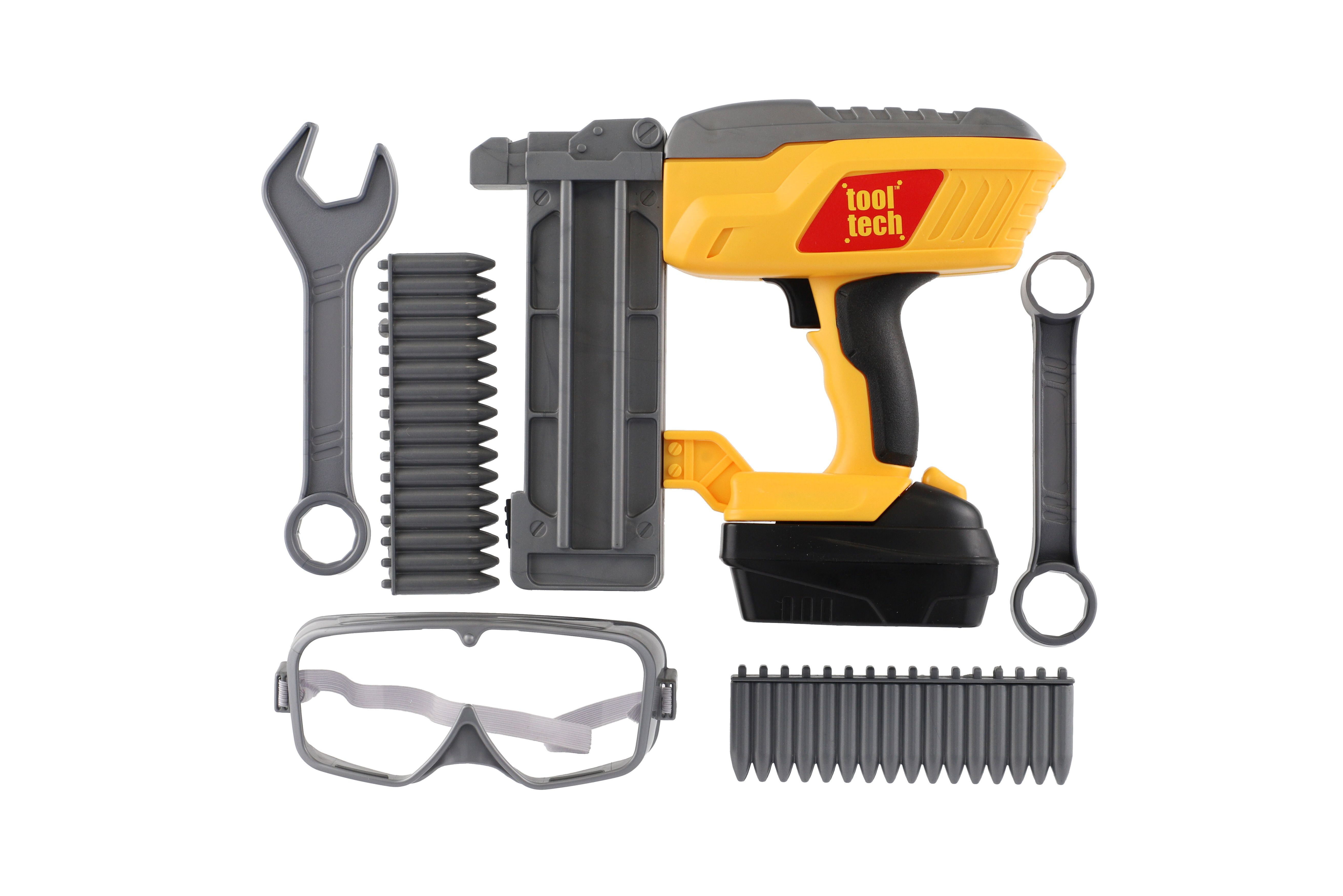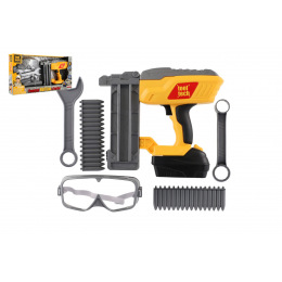 Nádherná sada pro malé kutily. Souprava obsahuje ochranné brýle, klíče, plastové náboje hřebíky a samozřejmě nastřelovací pistoli. Užijete si tak spoustu zábavy při drobných opravách. Pistole má vyjímatelný pack, kde jsou uloženy baterie. Baterie 2x AA jsou součástí balení. Rozměry balení 42 x 22 x 7 cm. Vhodné pro děti od 3 let.