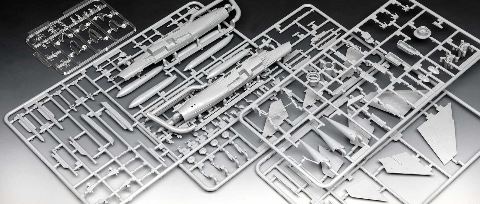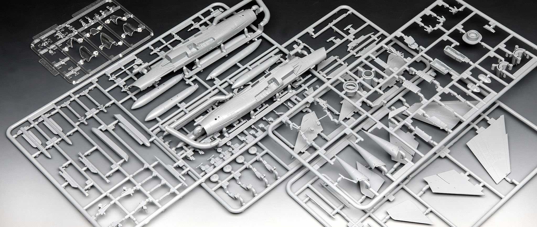 Plastový model (nesestavený), ilustrovaný vícejazyčný návod na sestavení, obtisky, samolepky