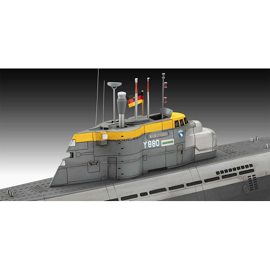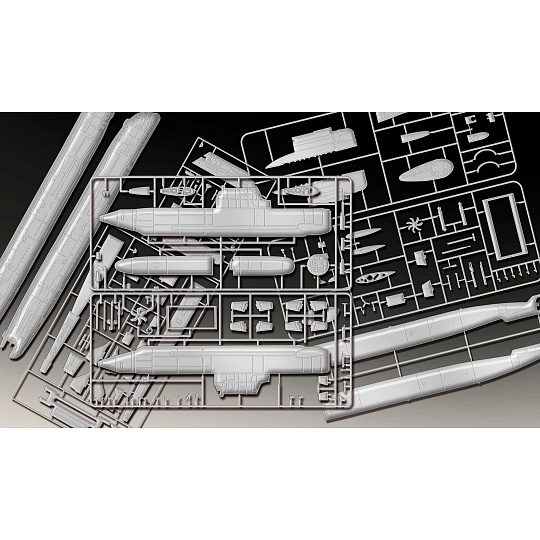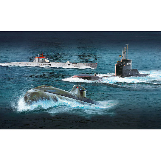 Modely ponorek ke slepení. Velikost: 1:144; 53,3 cm + 33,8 cm + 39,7 cm. Balení obsahuje: 154 dílků ke slepení.