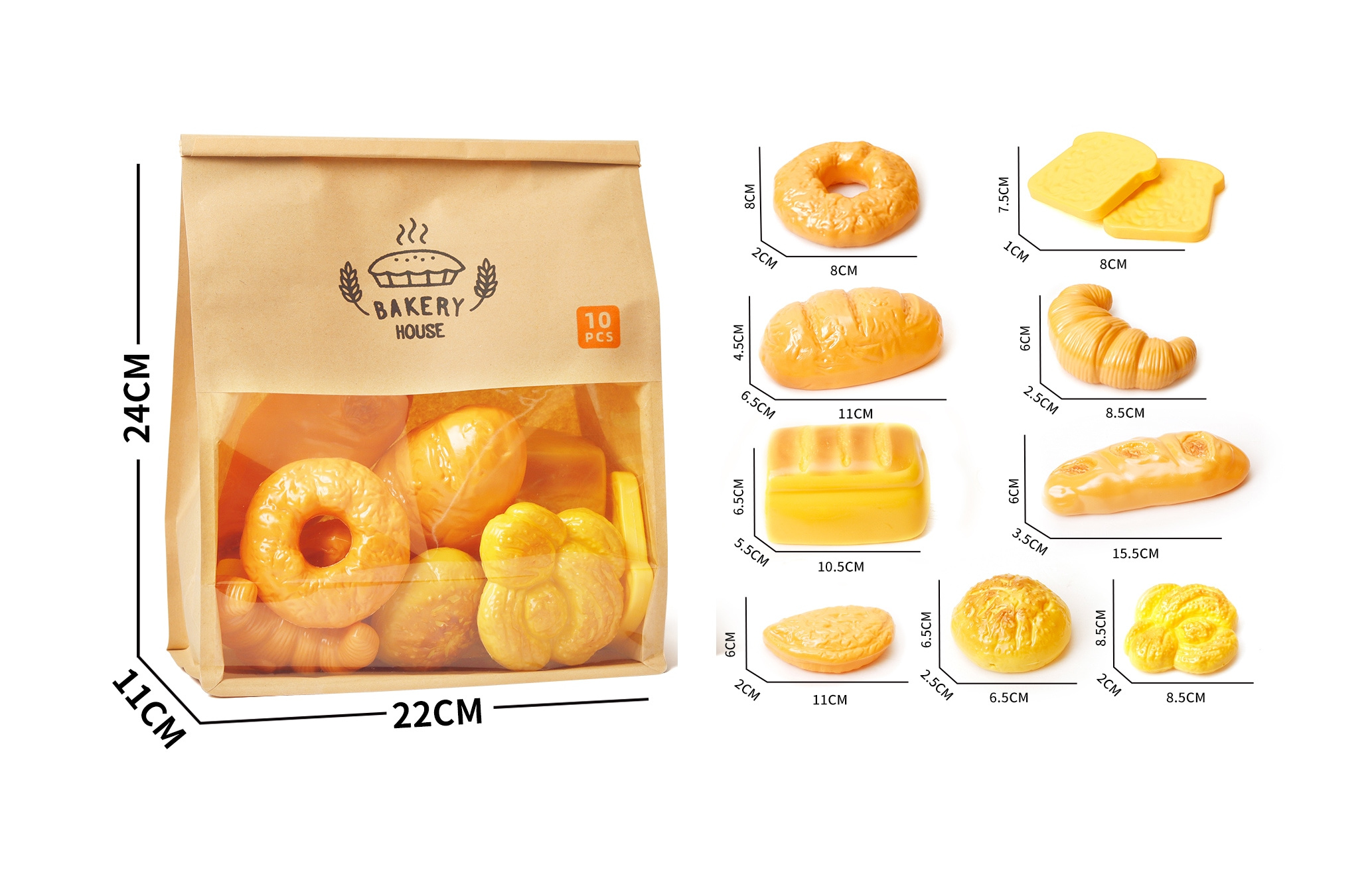 Různé druhy pečiva rozšiřují možnosti hry a umožňují dětem hrát si na různé situace (snídaně, svačina, návštěva pekárny).