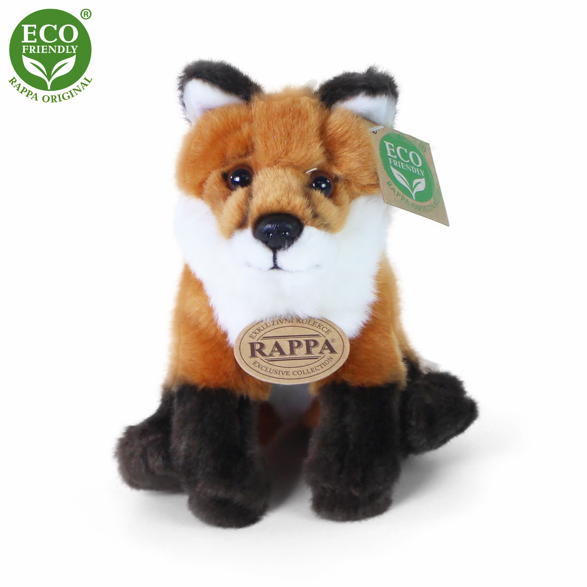 Plyšová liška měří 18 cm a díky těm nejkvalitnějším materiálům se řadí do Exkluzivní kolekce plyšových hraček značky Rappa. Díky ručnímu zpracování každého kusu navíc vypadá jako živá. Proč označení ECO-FRIENDLY? Rappa si je vědoma všech dopadů na životního prostředí, zaměřuje se na udržitelnost a omezení používání plastů na minimum. Proto je výplň hraček vyrobena z recyklovaných materiálů, zejména PET lahví. Ta je však zcela nezávadná a vhodná i pro děti od narození. FUN FACT: Věděli jste, že lišky mají neobyčejně dobrý sluch a dokážou zaslechnout i hlodavce, který se pohybuje pod sněhovou pokrývkou?