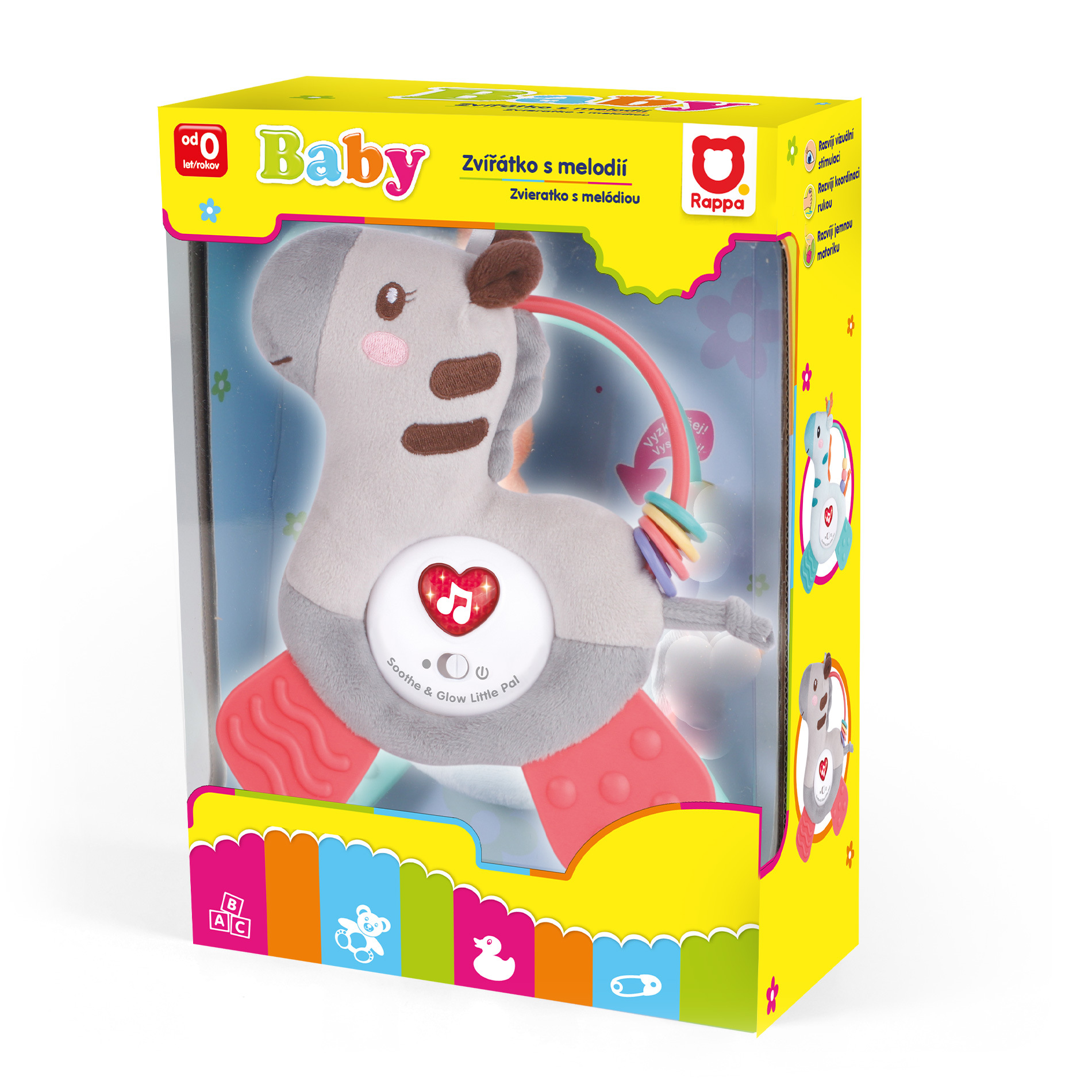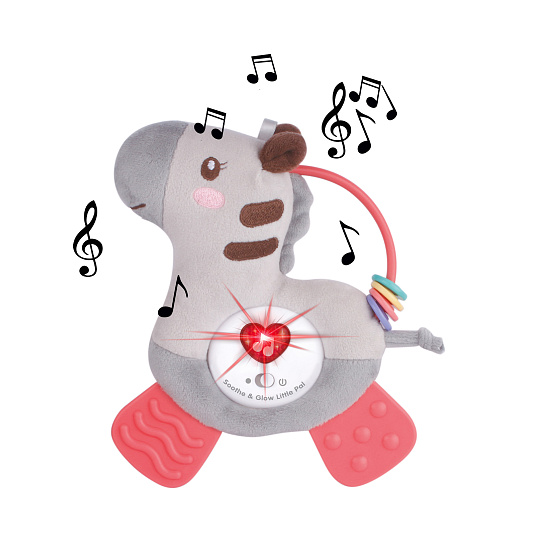 Veselé plyšové kousátko - zebra pro naše nejmenší děti. Při stisknutí barevně bliká a vydává zvuky. Hračka rozvíjí smyslové vnímání dítěte a podněcuje jeho fantazii. Hračka funguje na 3 baterie typu AG13, které jsou součástí výrobku. Přiložen i praktický klip na uchycení do kočárku.