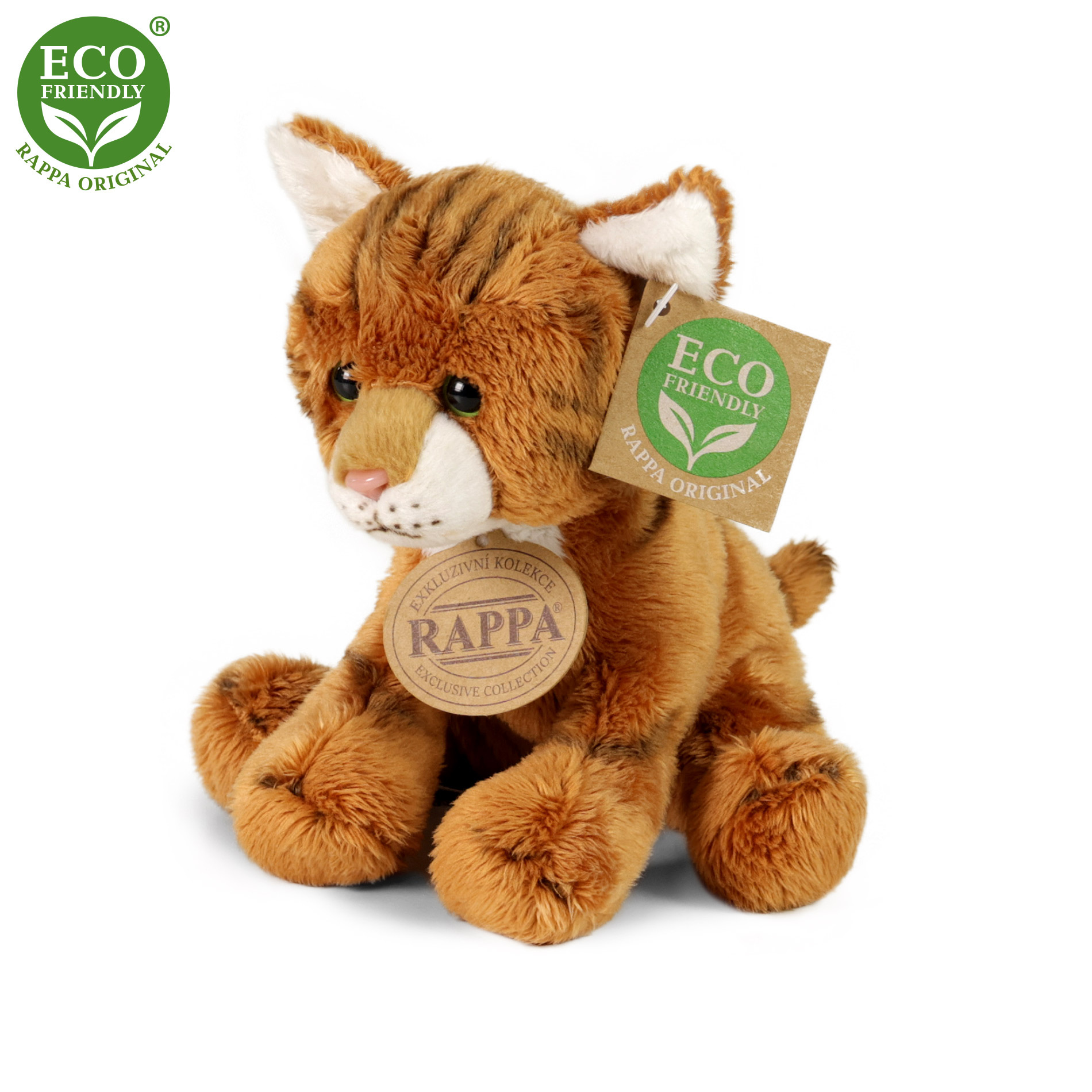 Plyšová kočka měří 14 cm a díky těm nejkvalitnějším materiálům se řadí do Exkluzivní kolekce plyšových hraček značky Rappa. Díky ručnímu zpracování každého kusu navíc vypadá jako živá. Proč označení ECO-FRIENDLY? Rappa si je vědoma všech dopadů na životního prostředí, zaměřuje se na udržitelnost a omezení používání plastů na minimum. Proto je výplň hraček vyrobena z recyklovaných materiálů, zejména PET lahví. Ta je však zcela nezávadná a vhodná i pro děti od narození. Cena je za 1 kus. FUN FACT: Věděli jste, že kočky umí příst i při nádechu i při výdechu a ne vždy to znamená, že jsou spokojené? Cena je uvedena za 1 ks.