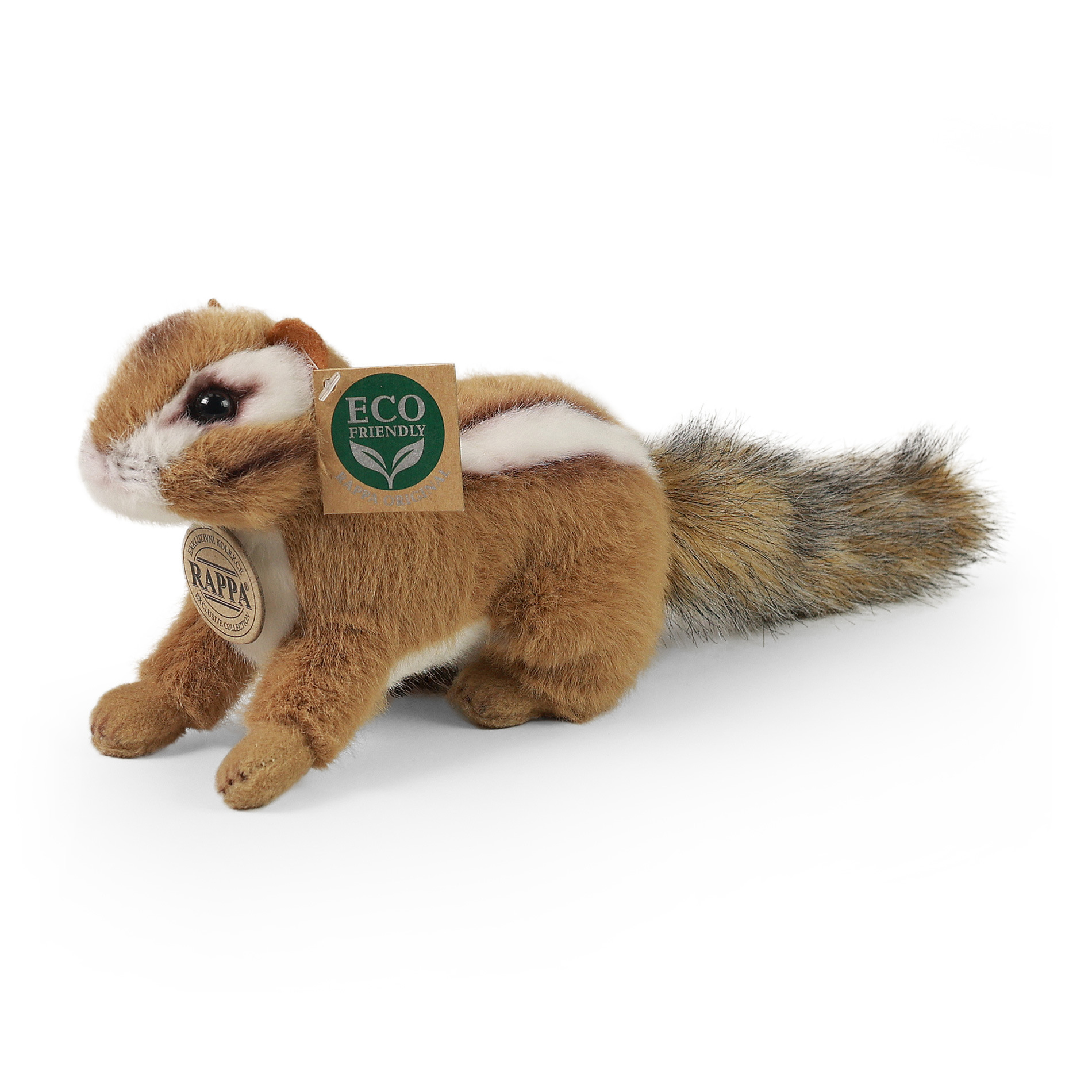Plyšový čipmank měří 17 cm a díky těm nejkvalitnějším materiálům se řadí do Exkluzivní kolekce plyšových hraček značky Rappa. Díky ručnímu zpracování každého kusu navíc vypadá jako živý. Proč označení ECO-FRIENDLY? Rappa si je vědoma všech dopadů na životního prostředí, zaměřuje se na udržitelnost a omezení používání plastů na minimum. Proto je výplň hraček vyrobena z recyklovaných materiálů, zejména PET lahví. Ta je však zcela nezávadná a vhodná i pro děti od narození. FUN FACT: Věděli jste, že čipmanci mají speciální lícní vaky v tvářích, do kterých si ukládají jídlo?