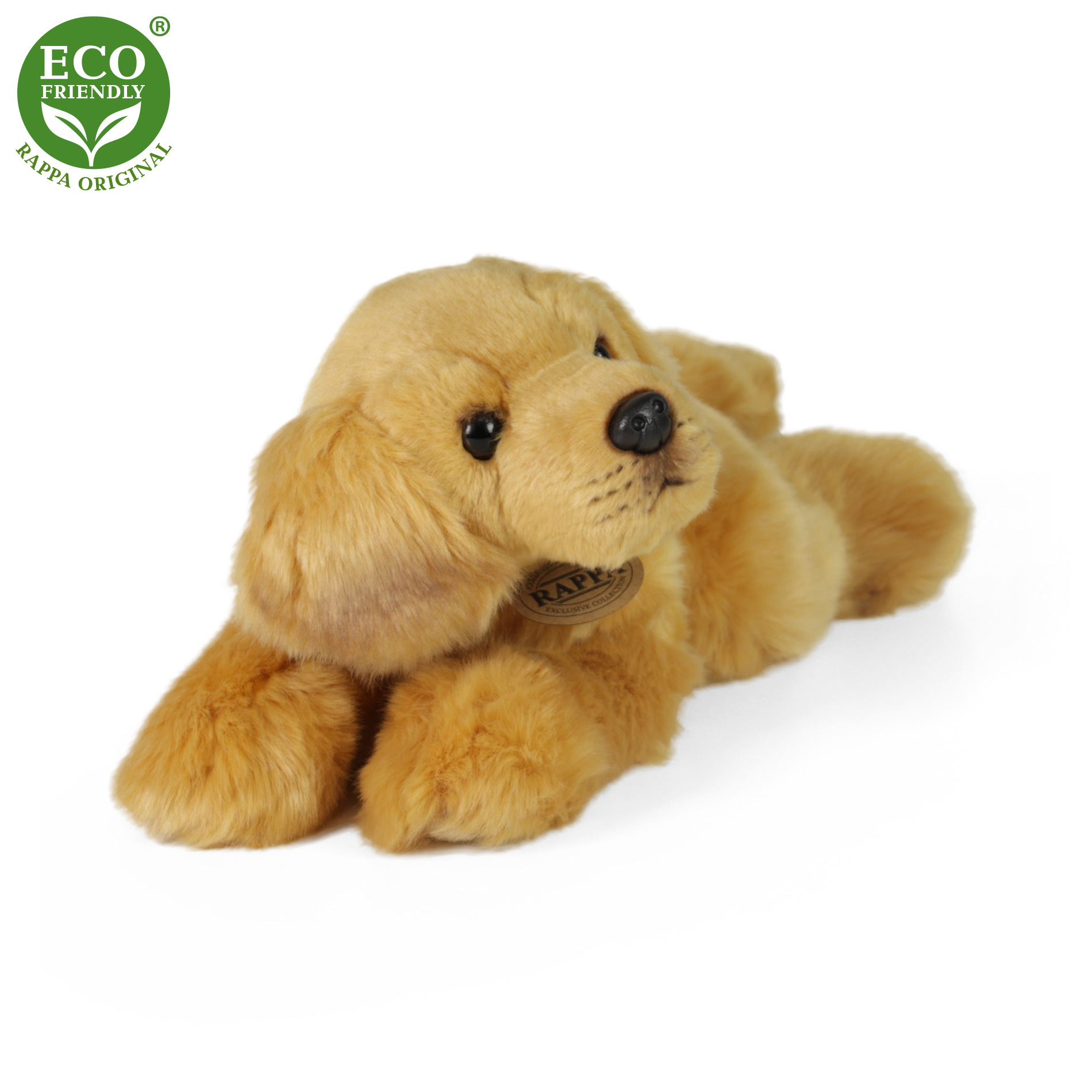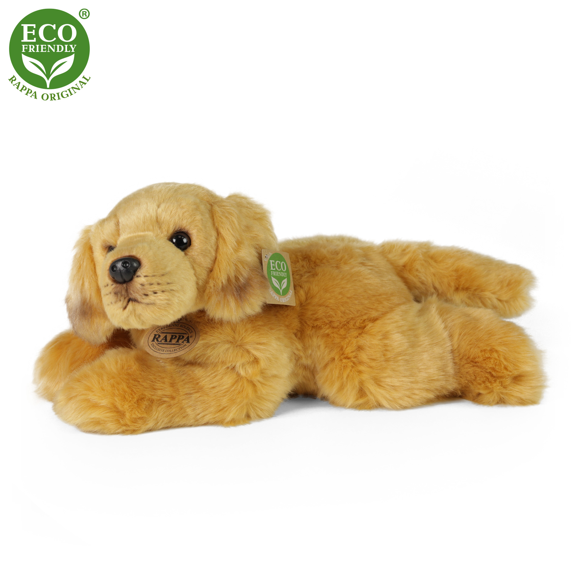 Plyšový pes rasy zlatý retrívr měří 30 cm a díky těm nejkvalitnějším materiálům se řadí do Exkluzivní kolekce plyšových hraček značky Rappa. Díky ručnímu zpracování každého kusu navíc vypadá jako živý. Proč označení ECO-FRIENDLY? Rappa si je vědoma všech dopadů na životního prostředí, zaměřuje se na udržitelnost a omezení používání plastů