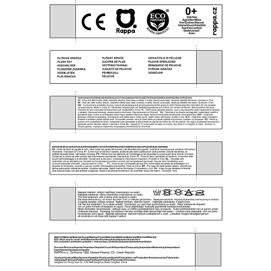 Roztomilý plyšový medvěd ve velikosti 18 cm je vyroben z vysoce kvalitní plyše a je tak součástí exkluzivní kolekce plyšových hraček RAPPA. Co to vlastně ECO-FRIENDLY znamená? Výplň plyšové hračky je vyrobena z recyklovaných PET lahví. Tento materiál je zcela bezpečný, na omak nerozeznatelný od standartní výplně a plně atestovaný pro bezp