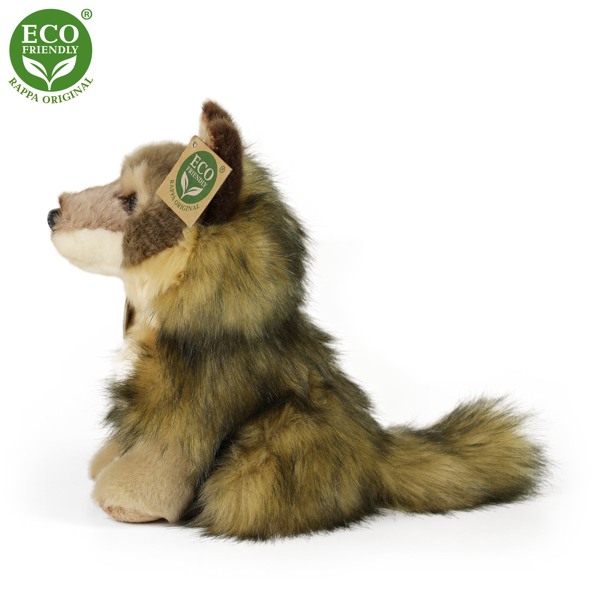 Krásný plyšový vlk ve velikosti 28 cm je vyroben z vysoce kvalitní plyše a je tak součástí exkluzivní kolekce plyšových hraček RAPPA. Co to vlastně ECO-FRIENDLY znamená? Výplň plyšové hračky je vyrobena z recyklovaných PET lahví. Tento materiál je zcela bezpečný, na omak nerozeznatelný od standartní výplně a plně atestovaný pro bezpečnost
