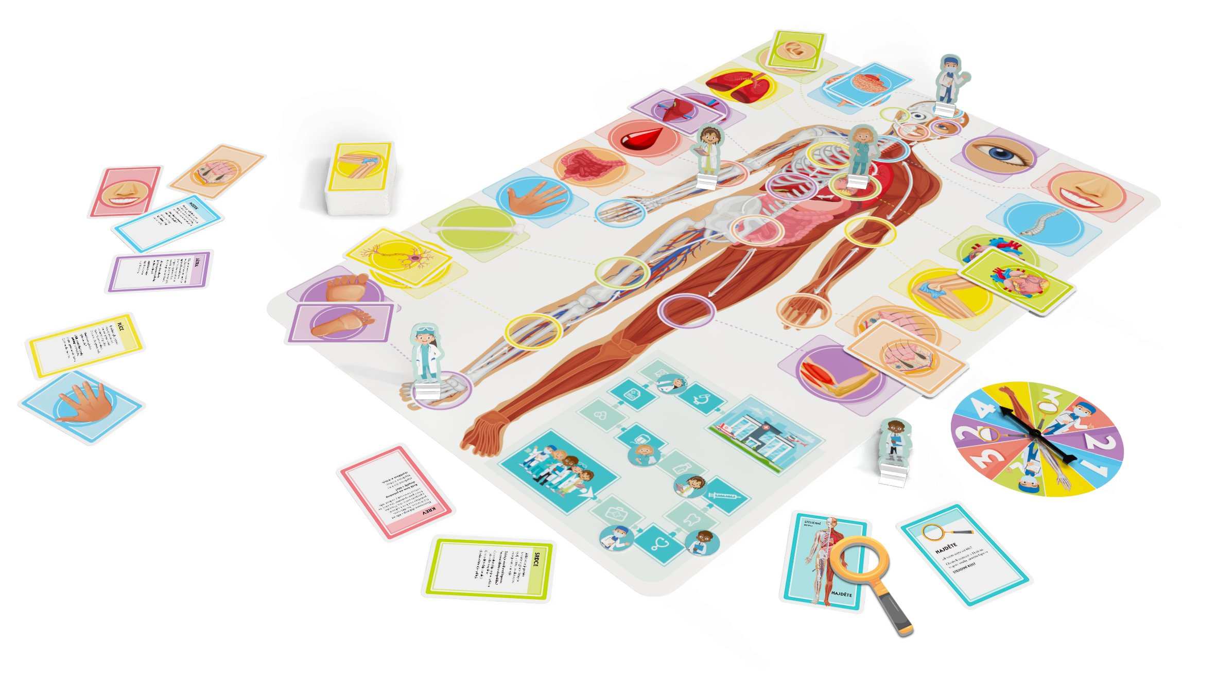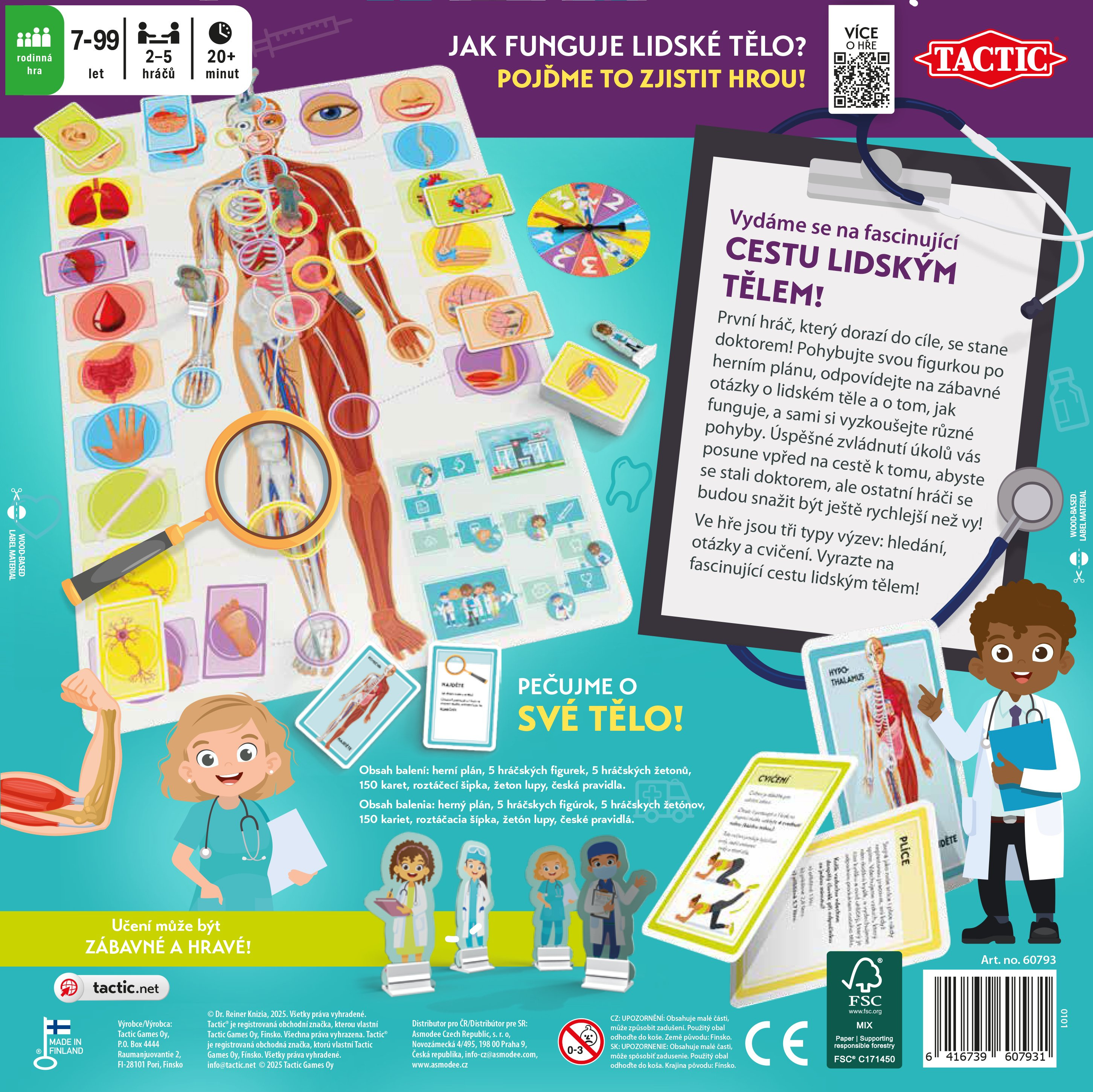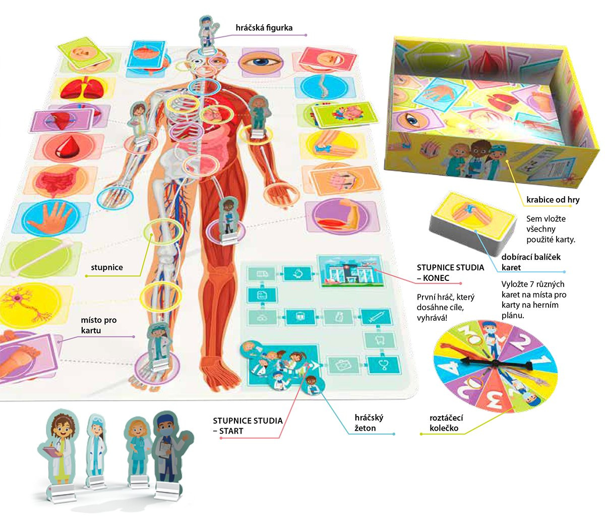 První hráč, který dorazí do cíle, se stane doktorem! Pohybujte svou figurkou po herním plánu, odpovídejte na zábavné otázky o lidském těle a o tom, jak funguje, a sami si vyzkoušejte různé pohyby. Úspěšné zvládnutí úkolů vás posune vpřed na cestě k tomu, abyste se stali doktorem, ale ostatní hráči se budou snažit být ještě rychlejší než vy!