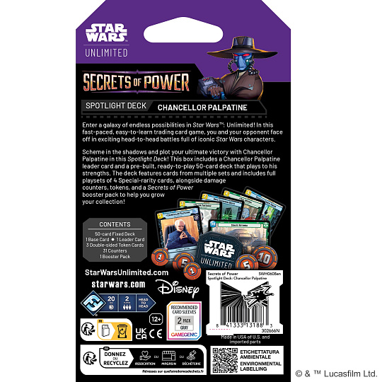 Vstupte do galaxie nekonečných možností ve hře Star Wars: Unlimited! V této rychlé a snadno pochopitelné sběratelské karetní hře si změříte síly s protihráčem v napínavých soubojích plných ikonických postav ze světa Star Wars. V ten pravý okamžik odhalte, co máte v ruce s Padmé Amidalou, anebo kujte pikle ve stínech a plánujte své konečné vítězství s kancléřem Palpatinem v tomto Spotlight Decku! Tento předpřipravený balíček s 50 kartami obsahuje vše, co potřebujete ke vstupu do šesté sady Secrets of Power.