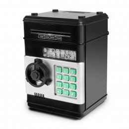 Zábavný elektronický trezor na bankovky a mince. Je velmi dobrým pomocníkem, jak naučit děti šetřit své vlastní peníze a plánovat výdaje. Tato pokladnička na peníze je modernější variantou tradičního prasátka. V případě potřeby lze peníze po zadání správného čtyřmístného PIN kódu ze sejfu odebrat. Otočením kolečka sejf otevřete. Po nastavení je možné zvolit si vlastní heslo. Pokud bude trezor dlouho otevřený, spustí se alarm. Aby byla kasička pro dítě ještě atraktivnější, byla obohacena o zajímavé světelné a zvukové efekty. Do výrobku je nutné vložit 3 ks baterií typu AA, baterie nejsou součástí balení.