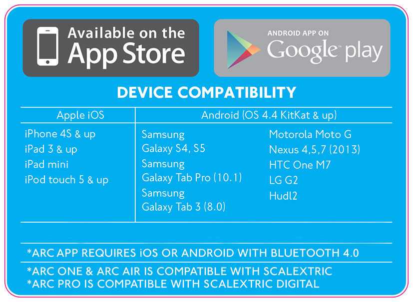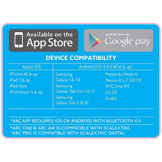 Scalextric ARC; první ovládací systém pro digitální autodráhy, který uživatelům umožňuje nastavovat a řídit závody pomocí chytrých zařízení jako telefon nebo tablet. S novým revolučním napájecím zdrojem ARC ONE od Scalextricu a aplikací ARC mohou uživatelé zažít najednou vzrušení opravdových závodů na dráze a napětí, které dosud znali jenom z počítačových her.