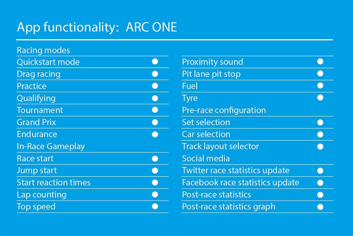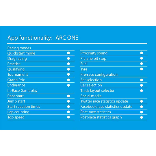 ARC ONE posouvá autodráhové závodění na tu nejvyšší úroveň, neboť umožňuje závody s až 6 autíčky najednou, přejíždění mezi dráhami, zavedení samostatné zastávky v boxech, opotřebení brzd a pneumatik, spotřeby paliva a prohlížení statistik po skončení závodu. Přizpůsobte si závod výběrem funkcí - zvolte si typ závodu, jména jezdců a počet kol. Než vyrazíte na trať, abyste otestovali své schopnosti a vyzvali svého soupeře, přizpůsobte si a uložte nastavení závodu a nastavení vozu.