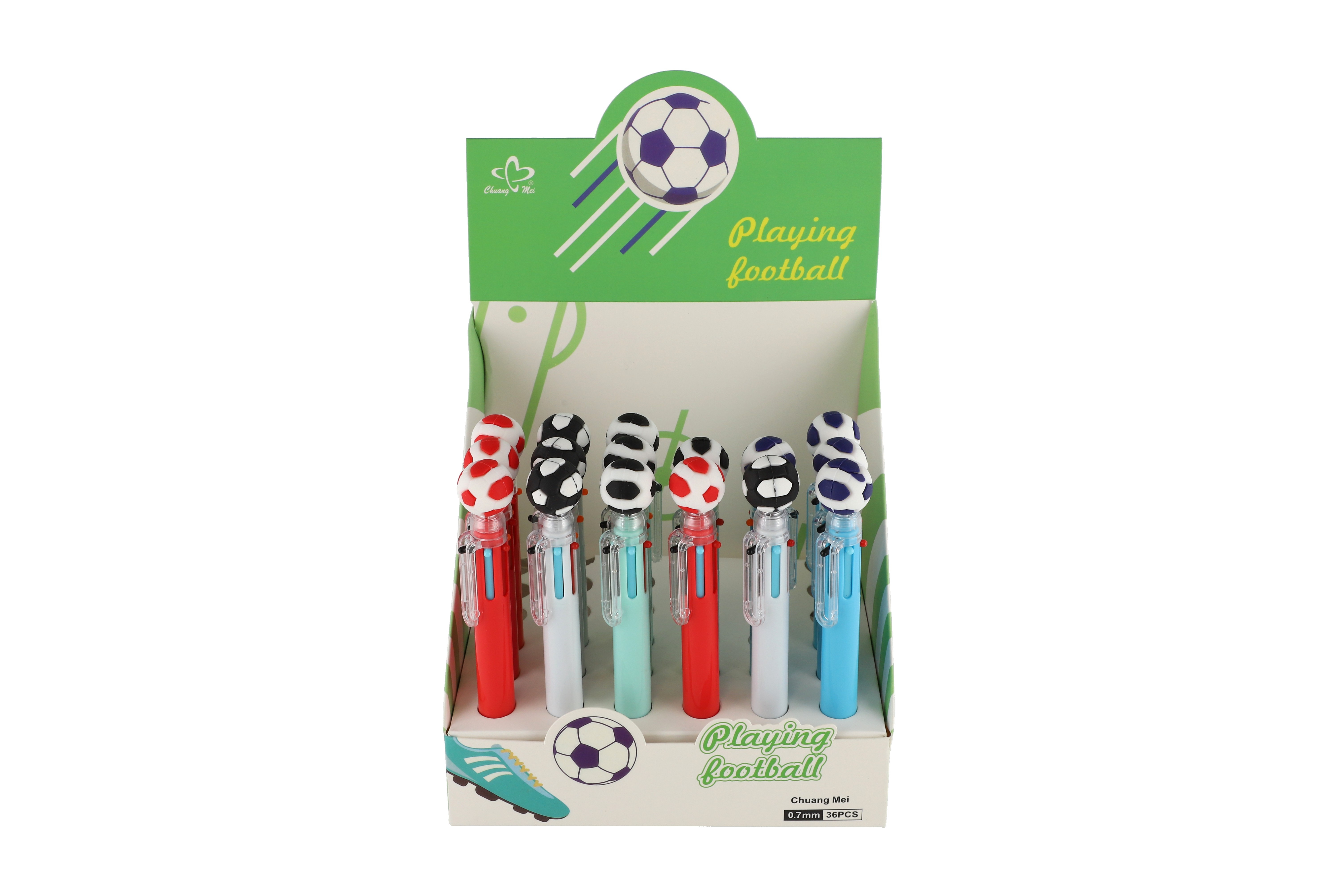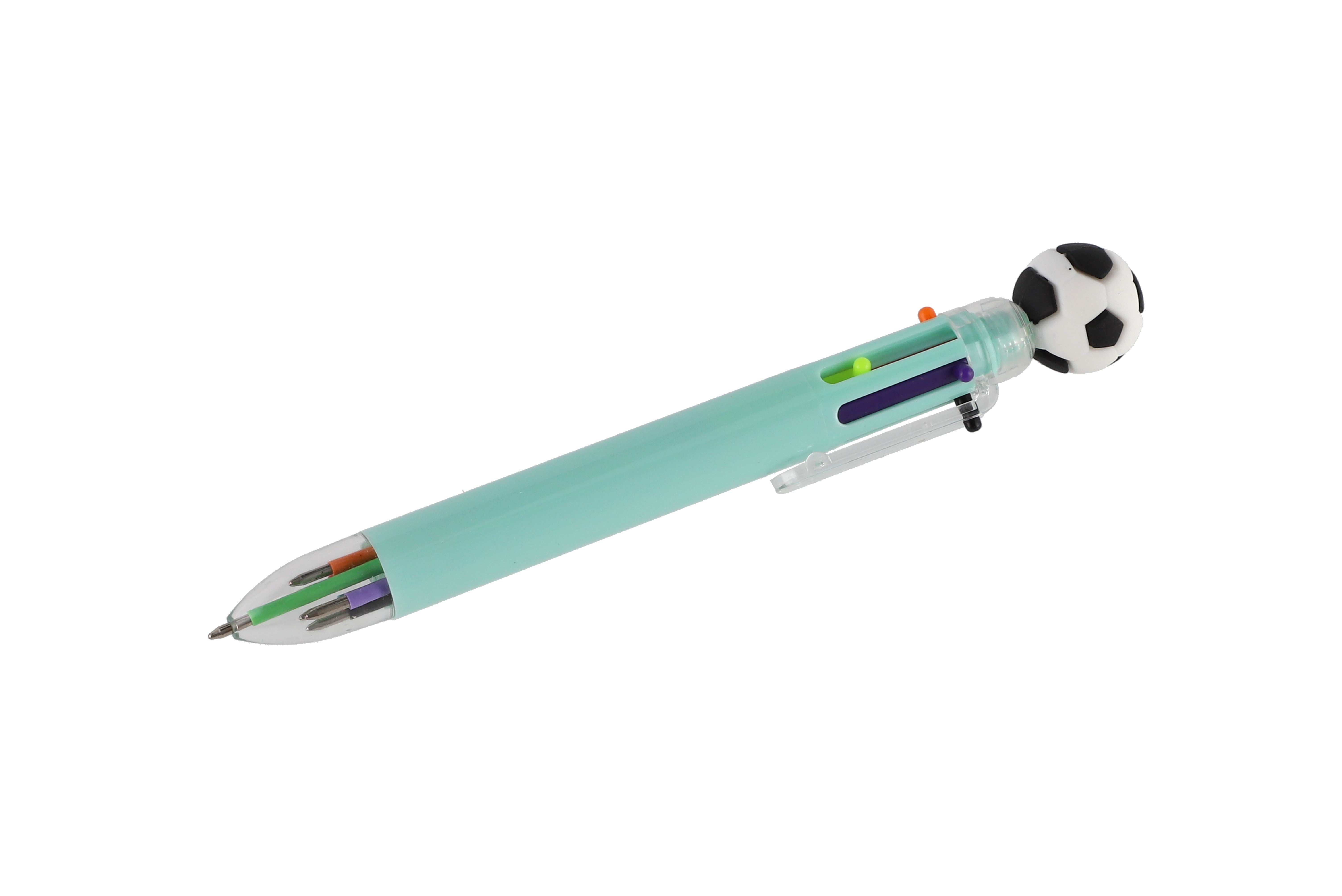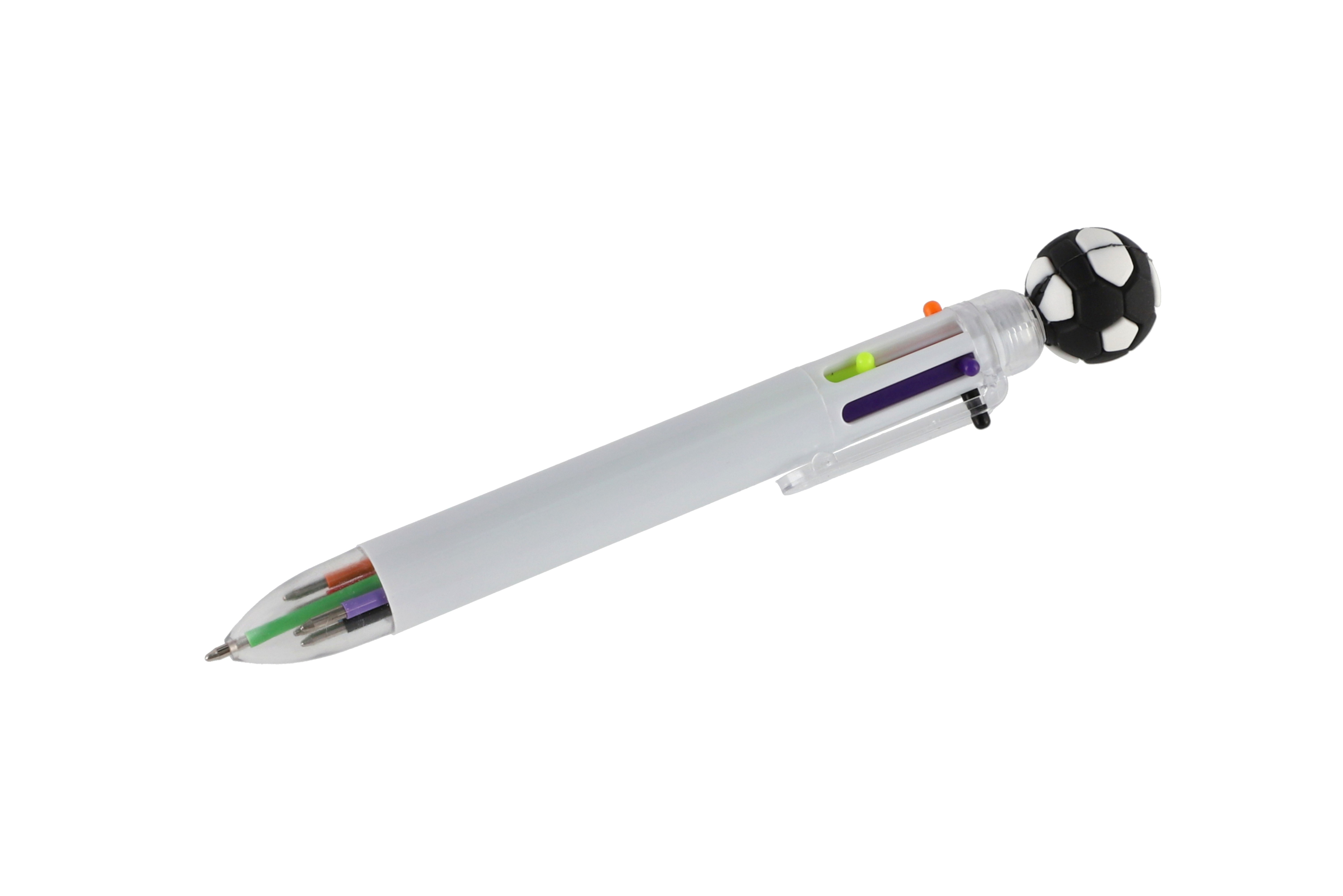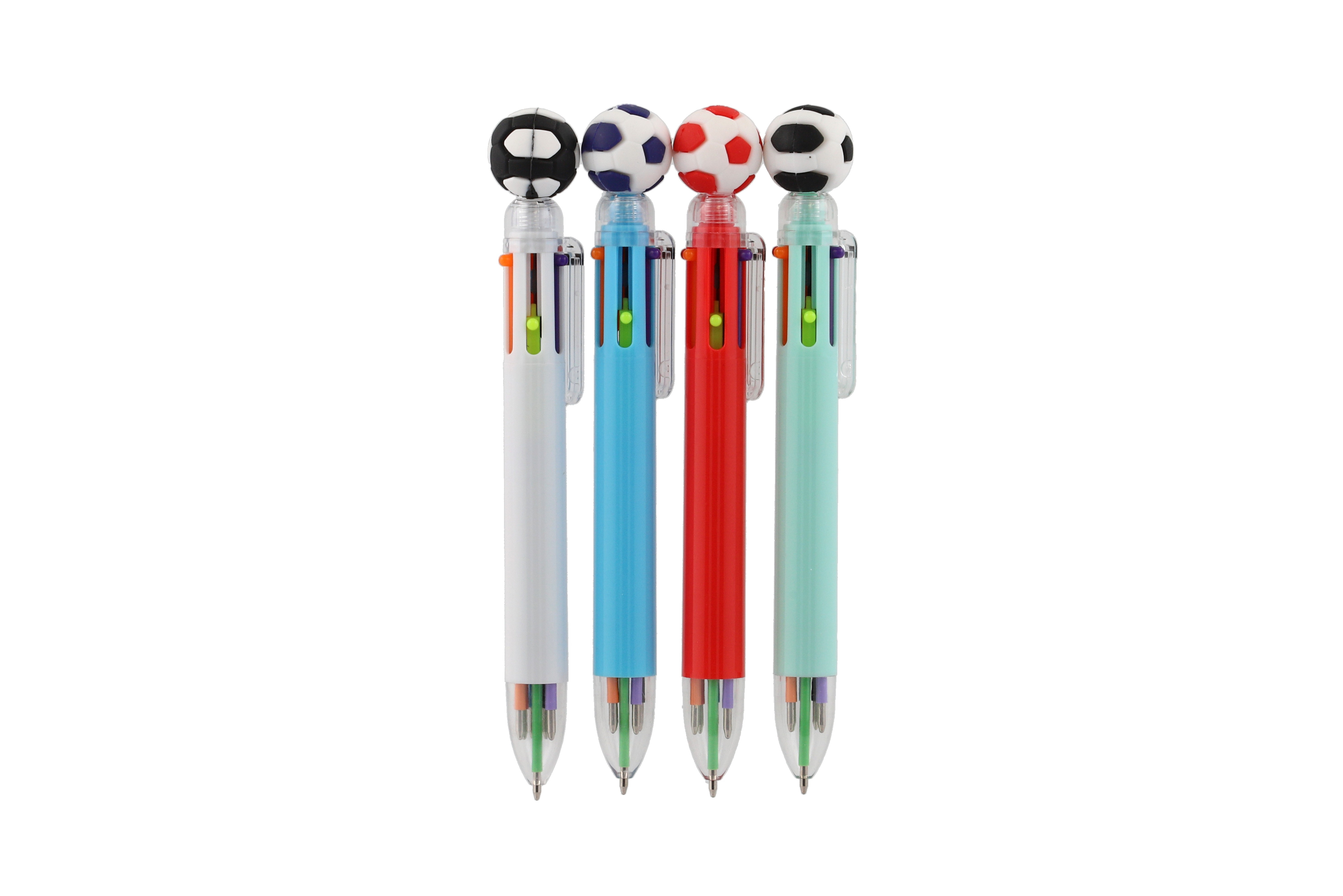Nápaditá propiska s motivem fotbalu prostě baví! Propiska s fotbalovým míčem zkrátka nesmí chybět v žádném penálu ani v žádném dětském šuplíku. Uvnitř se ukrývá 6 barevných tuh, které lze libovolně měnit. Přepínání mezi barvami je velmi snadné, stačí stlačit novou barvu. S touto propiskou si děti užijí spoustu zábavy, kreslení je bude bavit, navíc ji mohou využít jak ve škole, tak doma. Rozměr pera: 16 cm